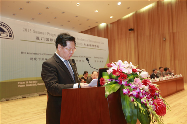 首先,厦门大学校长朱崇实教授、厦门市政协副主席钟兴国博士及研究院董事会主席史久镛法官致欢迎辞。朱校长对来世界各地的一百余名正式学员以及来自亚非法律协商组织成员国的二十二名法律官员表示热烈欢迎,向参与暑期班授课的教授致以诚挚的谢意,并肯定了研究院在十年的发展历程中对促进学术研究、交流与合作的作用。随后,钟兴国博士代表厦门市政协向暑期班开班暨十周年庆典表示热烈祝贺。程家瑞教授代为宣读了研究院董事会主席史久镛法官发来的致辞。史法官在致辞中回顾了研究院从初创到逐步成熟的十年轨迹,对来自世界各地、致力于国际法研究的讲员和学员所付出的不懈努力和宝贵支持表示衷心的感谢。他相信,今年研究院将继续见证一场国际法学界的盛典。