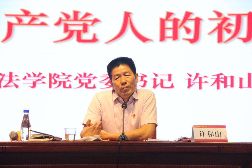 在新中国70周年华诞来临之际,2019年9月29日下午,法学院党委组织开展了“不忘初心、牢记使命”主题教育之书记讲党课,法学院党委书记许和山在模拟法庭为2019级本科新生讲述了“共产党人的初心”,活动由法学院党委副书记张伟主持。