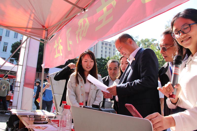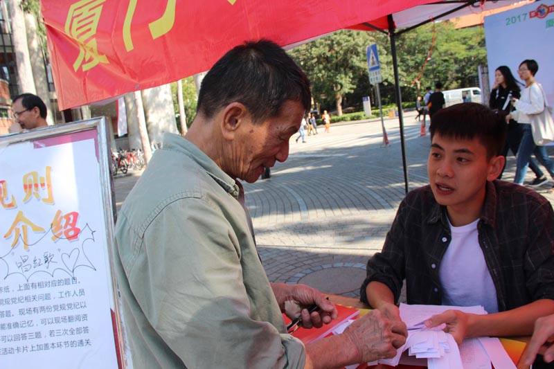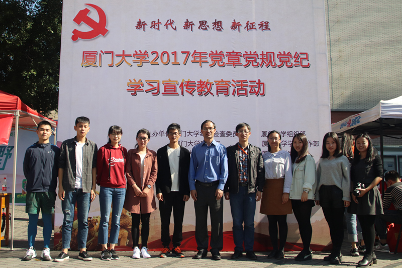 12月3日上午10时,厦门大学2017年党章党规党纪学习宣传教育活动在三家村广场举行。厦门大学党委副书记林东伟、厦门大学党委组织部部长梁卫中、厦门大学纪委副书记林金枝、厦门大学学生工作部(处)副处长王洁松、厦门大学校团委副书记廖晓波、厦门大学法学院党委书记李智勇、厦门大学法学院党委副书记郭锦星、厦门大学法学院副院长朱炎生、厦门大学法学院团委书记高斌、厦门大学法学院研究生辅导员宋磊华参加了活动。