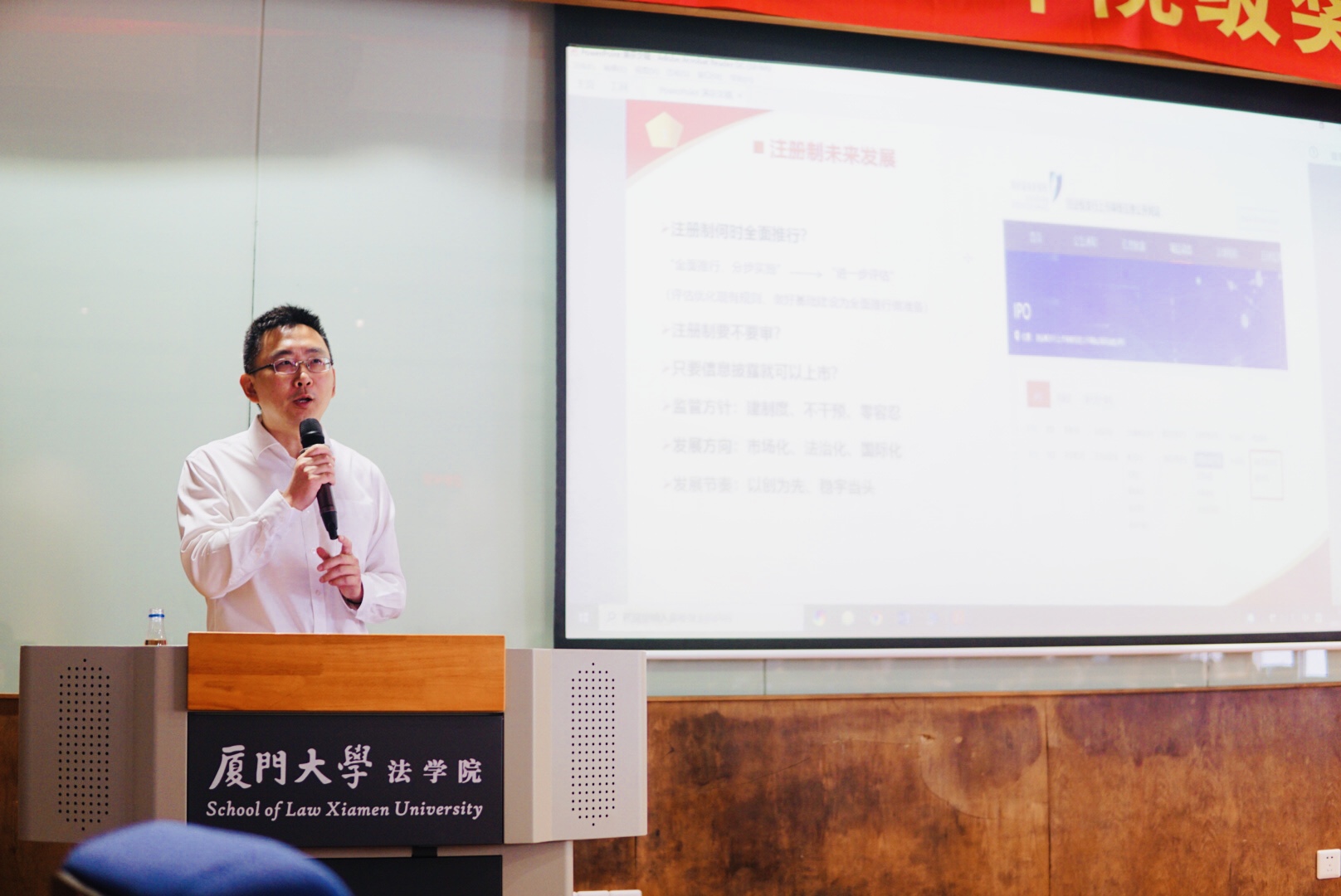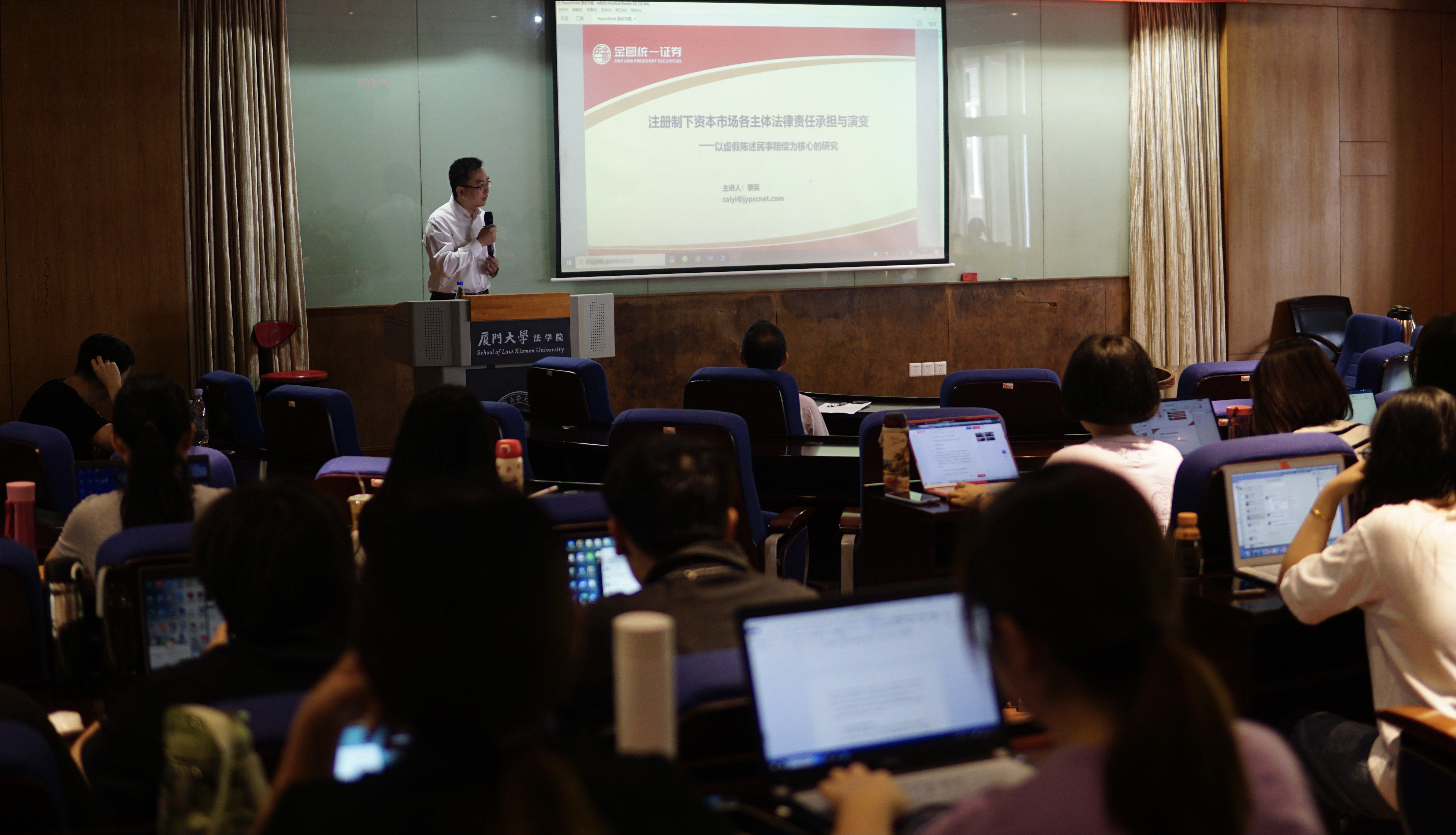 蔡奕博士以《注册制下资本市场各主体法律责任承担与演变——以虚假陈述民事赔偿为核心的研究》为主题,讲座从什么是注册制、虚假陈述案件各方的民事责任、证券公司合规与风险管理工作以及法学院学生就业机遇四大板块依次展开。