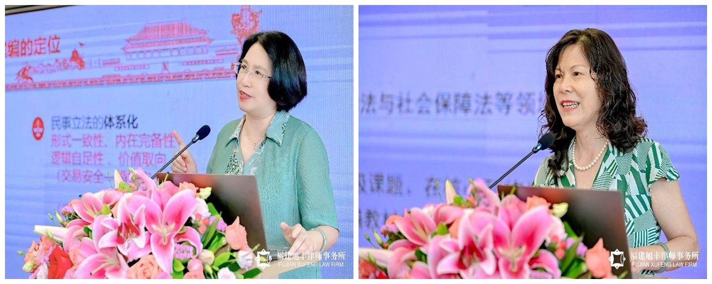 厦门大学法学院教授、厦门大学妇女/性别研究与培训基地常务副主任、中国法学会婚姻家庭法学研究会副会长蒋月报告《法律和社会约束下的婚姻家庭行为》。她依据《民法典》等相关法律规定,结合相关统计数据、司法判例等充分论述了“反家庭暴力与婚姻家庭文明”、“诚实信用与夫妻忠实”以及“父母关系的新规则”等问题。在该单元与谈环节,厦门市律师协会婚姻家庭与财富传承委员会主任梁瑛律师,厦门市律师协会婚姻家庭与财富传承委员会副主任、福建旭丰律师事务所刘福来律师担任与谈嘉宾,与蒋月就夫妇忠实义务、平等原则问题进行了交流。厦门大学法学院教授、《厦门大学学报》(哲社版)编辑部主任、中国法学会婚姻家庭法学研究会常务理事何丽新跟大家分享的报告题目是《<民法典婚姻家庭编司法解释一>中女性财产权保护问题思考》。何丽新教授评议解说了民法典体系化与婚姻家庭编的定位、婚姻契约论与女性财产权等内容,也就司法实践中争议较多的“忠诚协议的财产性效力”问题阐明了其观点。福建旭丰律师事务所刁玫律师主持该单元与谈环节,并与厦门市律师协会婚姻家庭与财富传承委员会副主任卢玉琼律师一起,同何丽新交流讨论了女性财产权保护问题。