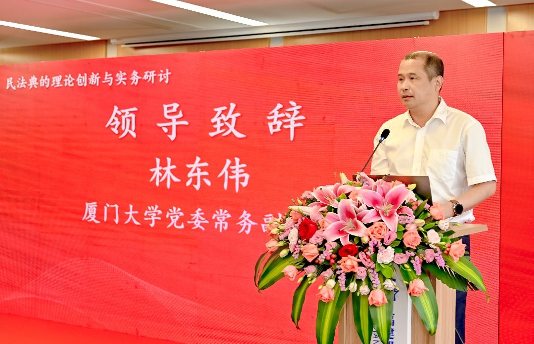 厦门大学党委常务副书记林东伟首先为本次论坛致辞。他表示,本次活动在《民法典》颁布两周年的重要节点举办,为进一步推动《民法典》的实施宣传营造了良好的环境和社会氛围,并提出了五点建议:一是突出学习宣传习近平法治思想;二是要发挥厦门大学法学学科优势与专业背景,加强理论研究,推动民法典不断完善与发展;三是创新民法典宣传形式,推进民法典学习宣传常态化;四是深入宣传民法典在保障人民群众合法权益、促进社会主义市场经济繁荣发展方面发挥的重大作用;五是引导广大师生和居民群众更加注重家庭、家教、家风。