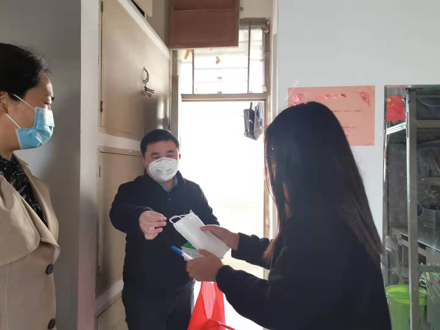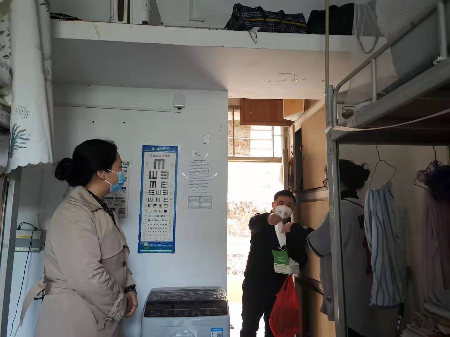 图8 党委副书记张伟、团委书记陈国渊给留校学生发放口罩、体温计