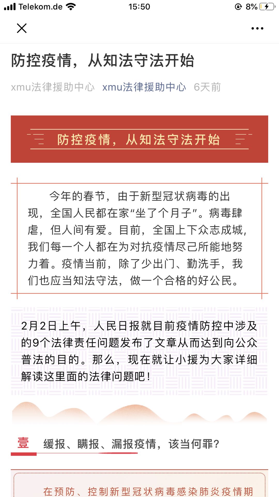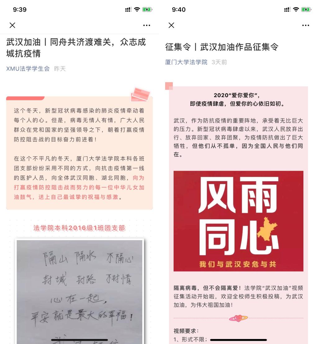 不忘初心、牢记使命。这场战“疫”是检验共产党员、共青团员守初心、担使命的试金石,疫情来袭,学院积极动员全体党员、团员投入到这场看不见硝烟的战争中,用行动对照初心,用担当书写使命,成立“厦门大学法学院留鄂师生临时党支部”、“厦门大学法学院留鄂本科生临时团支部”、“厦门大学法学院留鄂研究生临时团支部”,组织留在疫区(湖北)的39名师生争先锋、做表率,鼓励在做好自我防疫的前提下,及时通报疫情防控进展,积极宣传科学防疫知识,消除身边人员的恐慌心理,号召大家自觉成为防疫工作的“宣传小帮手”。积极利用专业知识,开展疫情产生导致的法律问题解答服务,成为身边群众的“法律小卫士”。