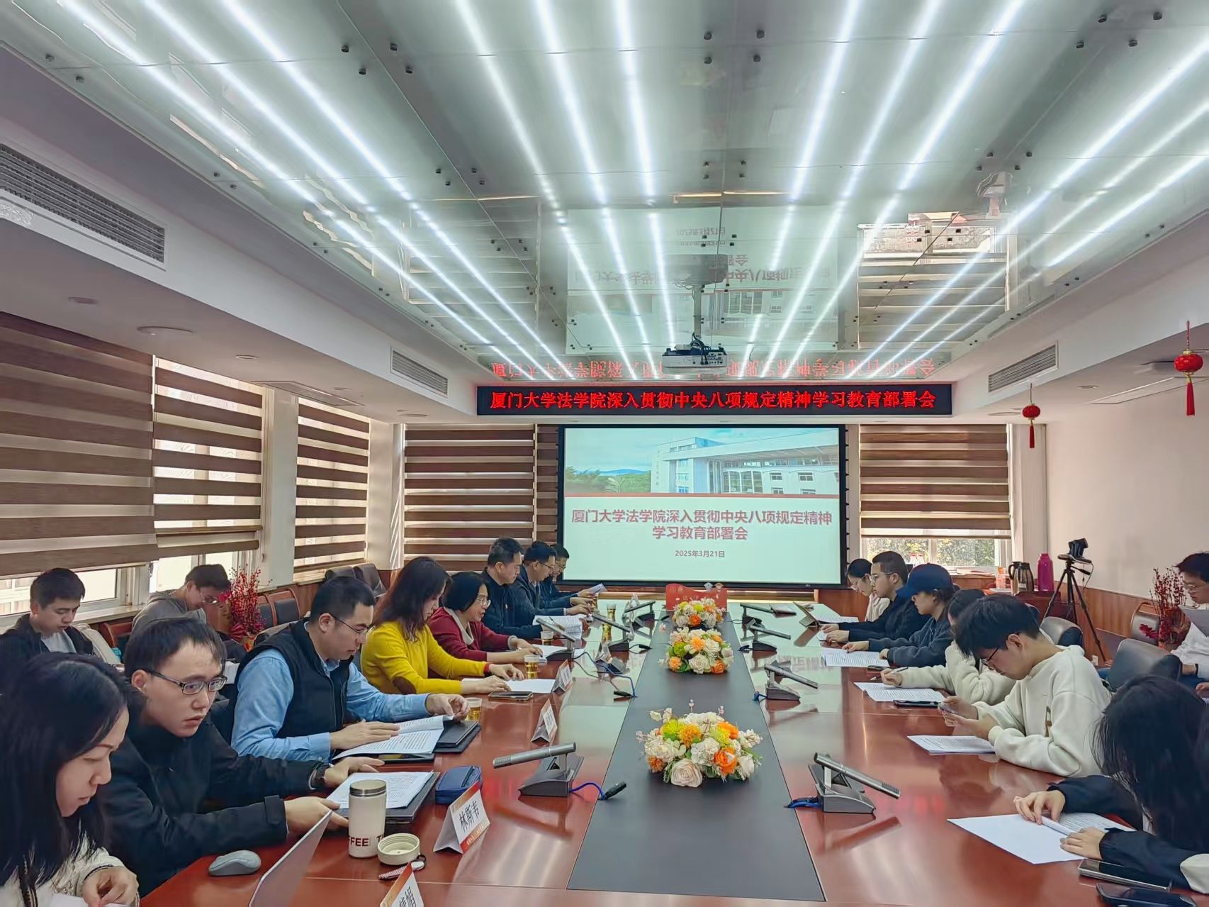 3月21日上午,法学院在C220会议室召开深入贯彻中央八项规定精神学习教育部署会。院党委委员、各师生党支部书记参加会议,院党委书记何丽新作工作部署。