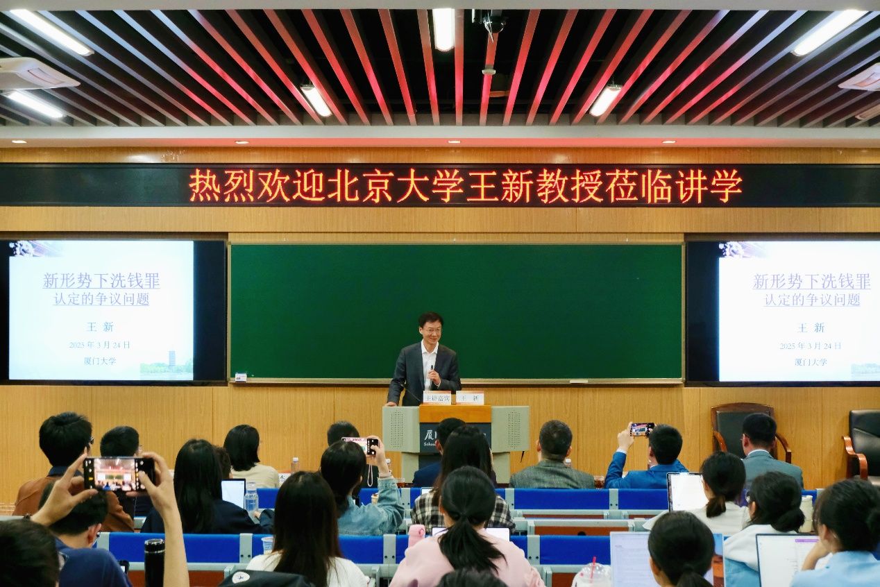 春和景明,鹭岛潮生。2025年3月24日晚,由厦门大学法学院与厦门大学经济犯罪研究中心联合主办的信实“青椒会”学术论坛第85期暨“中国刑法自主知识体系构建”系列讲座之四在法学院B137报告厅顺利举行。本次讲座以《新形势下洗钱罪认定的争议问题》为题,特邀北京大学法学院博士生导师王新教授担任主讲人。厦门大学法学院刑法学科带头人李兰英教授主持此次讲座,刑法教研室的吕英杰老师、刘炯老师、熊亚文老师、李晓龙老师、汪东升老师、邢文升老师、沈晓白老师参加与谈,法学院本硕博学生及校外实务界人士到场聆听学习。