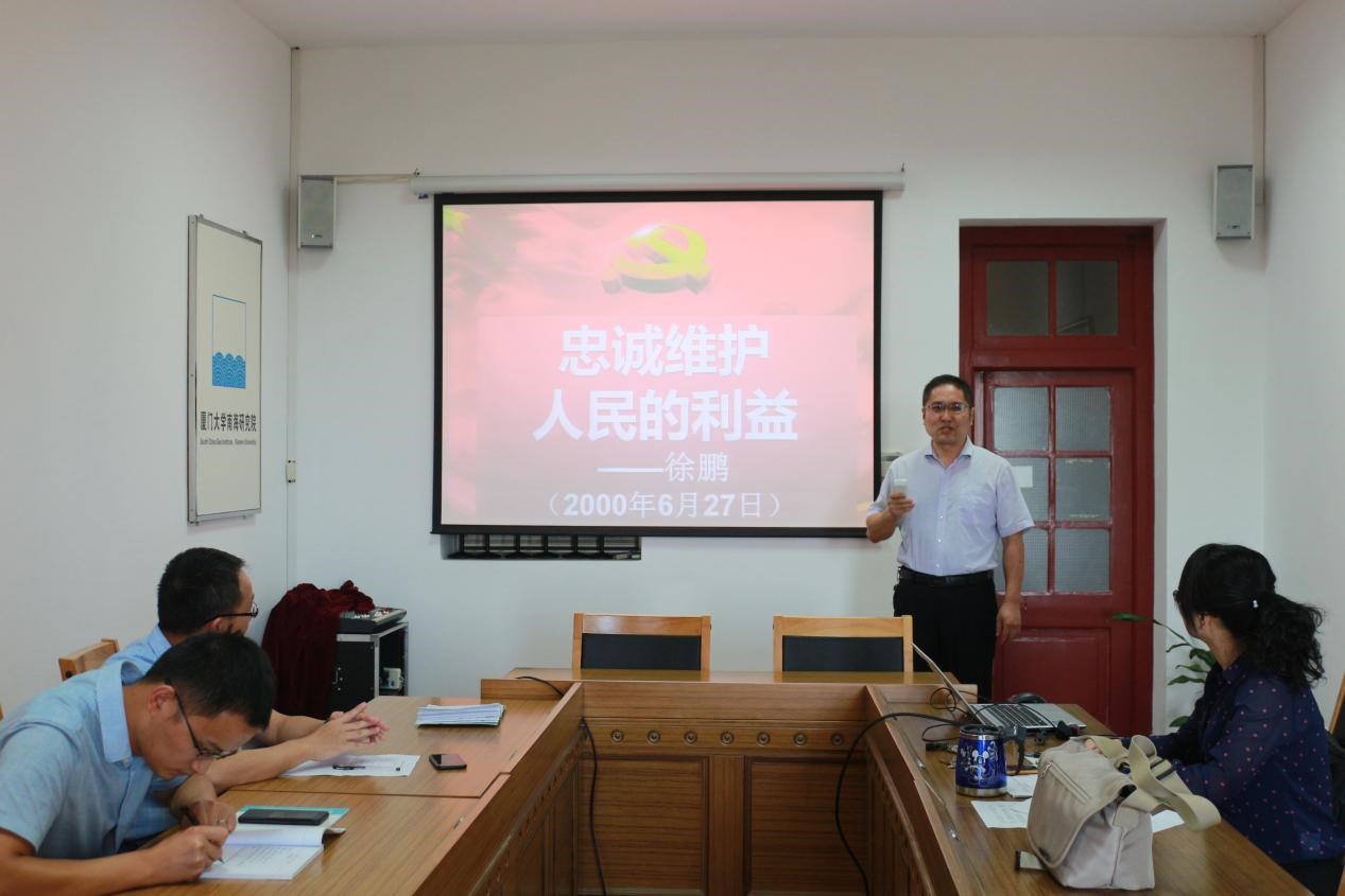 2019年9月25日下午3时,南海研究院教工党支部成员齐聚南安楼215会议室,开展固定党日+活动。本期的活动主题是“当初入党为什么”分享交流会。“当初入党为什么”,这是一个根本的动因问题,在中华人民共和国成立70周年即将来临之际,作为共产党员,我们深感本次主题的神圣涵义。提前一周,党支部已通知各位同志将自己的入党初衷凝练为一句话,结合自己的入党经历,向支部做三分钟左右的分享。