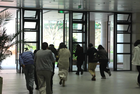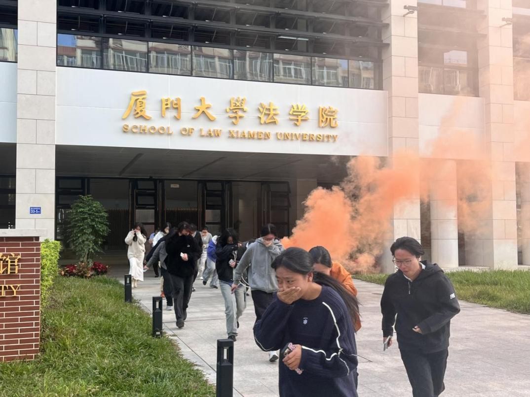 随后,两颗橙色烟雾弹在A栋和D栋教学楼点燃,模拟火灾场景,疏散应急预案立即启动。在消防广播通知以及安全员引导下,在场师生员工迅速沿逃生通道,有序撤离至安全区域,顺利地完成疏散演练。
