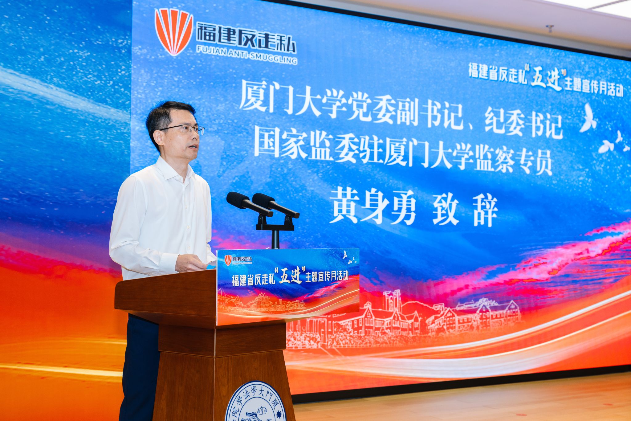 启动仪式上,厦门大学党委副书记、纪委书记、国家监委驻厦门大学监察专员黄身勇代表厦门大学对活动的召开表示祝贺。他指出,学校始终坚持以服务国家战略需求为导向,积极承担着高校培育法治传播、法治文化人才的重要使命。期待以本次启动仪式为契机,进一步深化与全省各反走私单位的交流合作,以更扎实的学术研究提供智库支持,以更精准的法治宣传凝聚育人共识,以更主动的法治服务担当社会责任,为构建“全社会关注、全民参与”的反走私综合治理新格局,持续注入厦大智慧与力量。