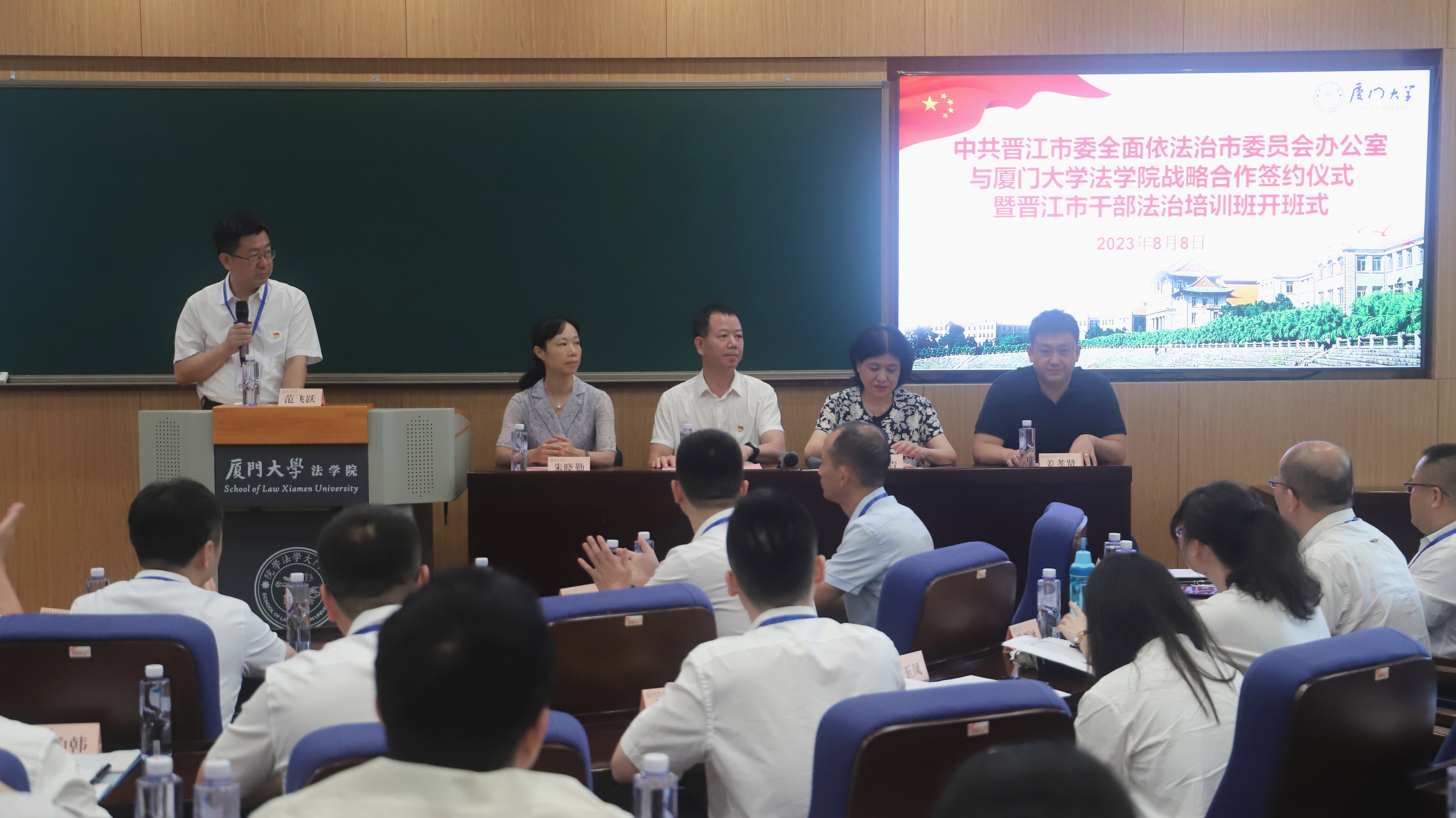 8月8日上午,中共晋江市委全面依法治市委员会办公室与厦门大学法学院战略合作签约仪式暨晋江市干部法治培训班开班仪式在法学院B138举行。晋江市委常委、政法委书记李志强,晋江市司法局局长范飞跃及晋江市干部法治培训班全体参训人员莅临我院参加签约仪式暨开班仪式。法学院院长宋方青教授、副院长朱晓勤教授、姜孝贤副教授等出席本次仪式。签约仪式由范飞跃局长主持。