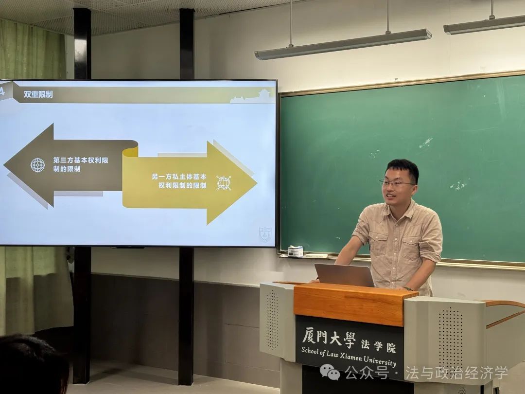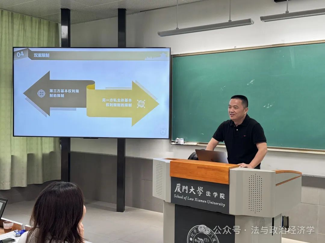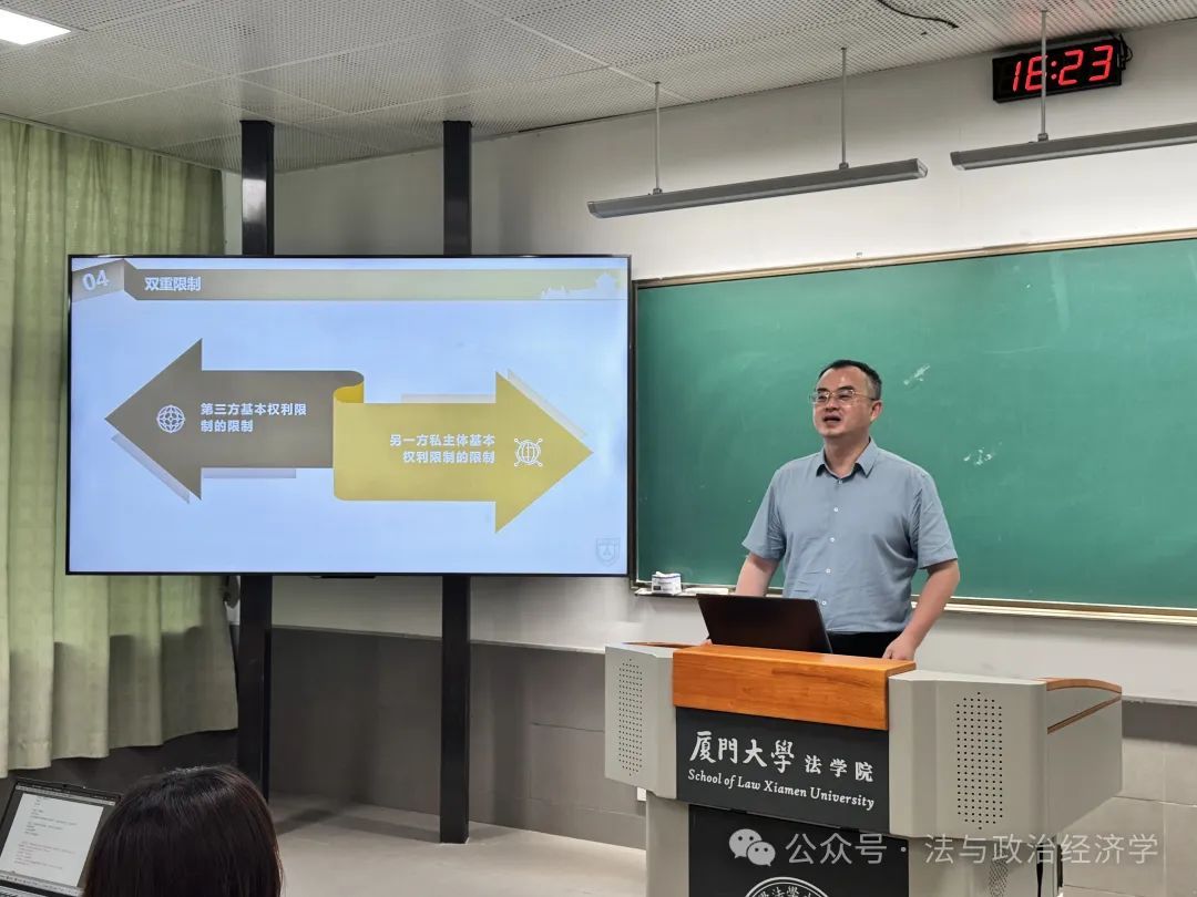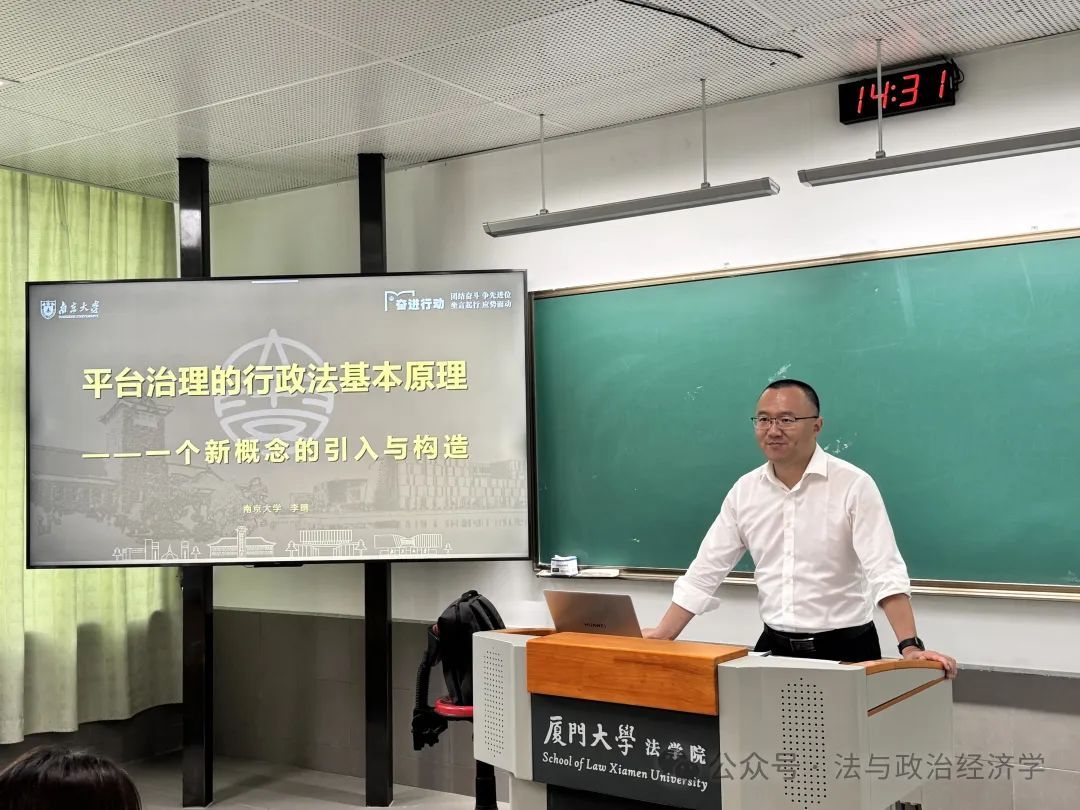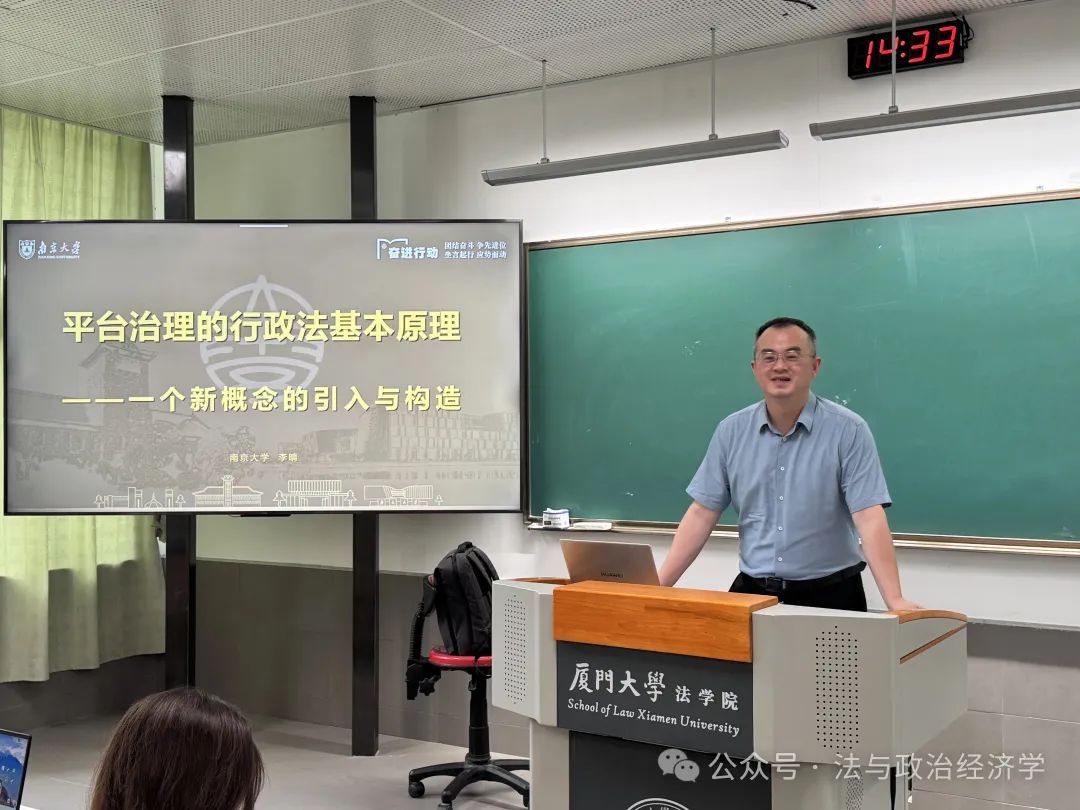 2025年5月19日下午,厦门大学法学院第91期信实“青椒会”学术论坛暨“数字法沙龙”第六期在法学院A204教室成功举办。本期沙龙的主题为“平台治理的行政法基本原理”,特别邀请到南京大学法学院副教授、清华大学法学博士、中国法学会行政法学研究会理事李晴老师担任主讲人,对外经济贸易大学法学院孔祥稳老师,厦门大学法学院刘连泰老师、吴旭阳老师、王敏老师、许瑞超老师等作为与谈人参与了本次活动。厦门大学本硕博数十名学生到场聆听。本期论坛由厦门大学法学院法与政治经济学研究中心主任毛海栋老师主持。
