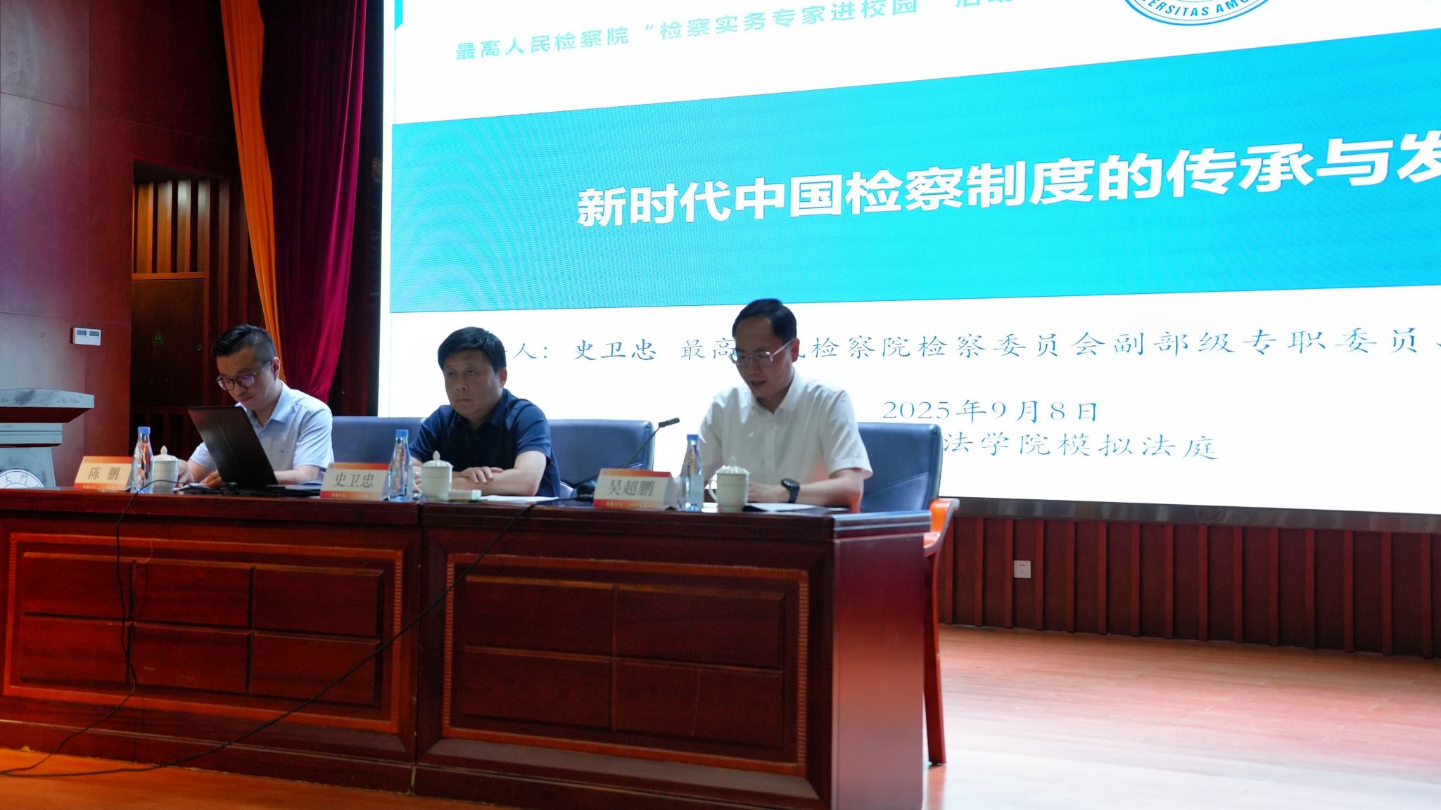 2025年9月8日晚,最高人民检察院“检察实务专家进校园”系列活动在厦门大学法学院模拟法庭顺利举行。最高人民检察院检察委员会副部级专职委员、二级大检察官史卫忠主讲《新时代中国检察制度的传承与发展》,厦门大学党委常委、副校长吴超鹏教授致辞,厦门大学法学院院长陈鹏教授主持讲座。最高人民检察院、福建省人民检察院、厦门市人民检察院有关同志及厦门大学法学院师生共百余人到场聆听讲座。