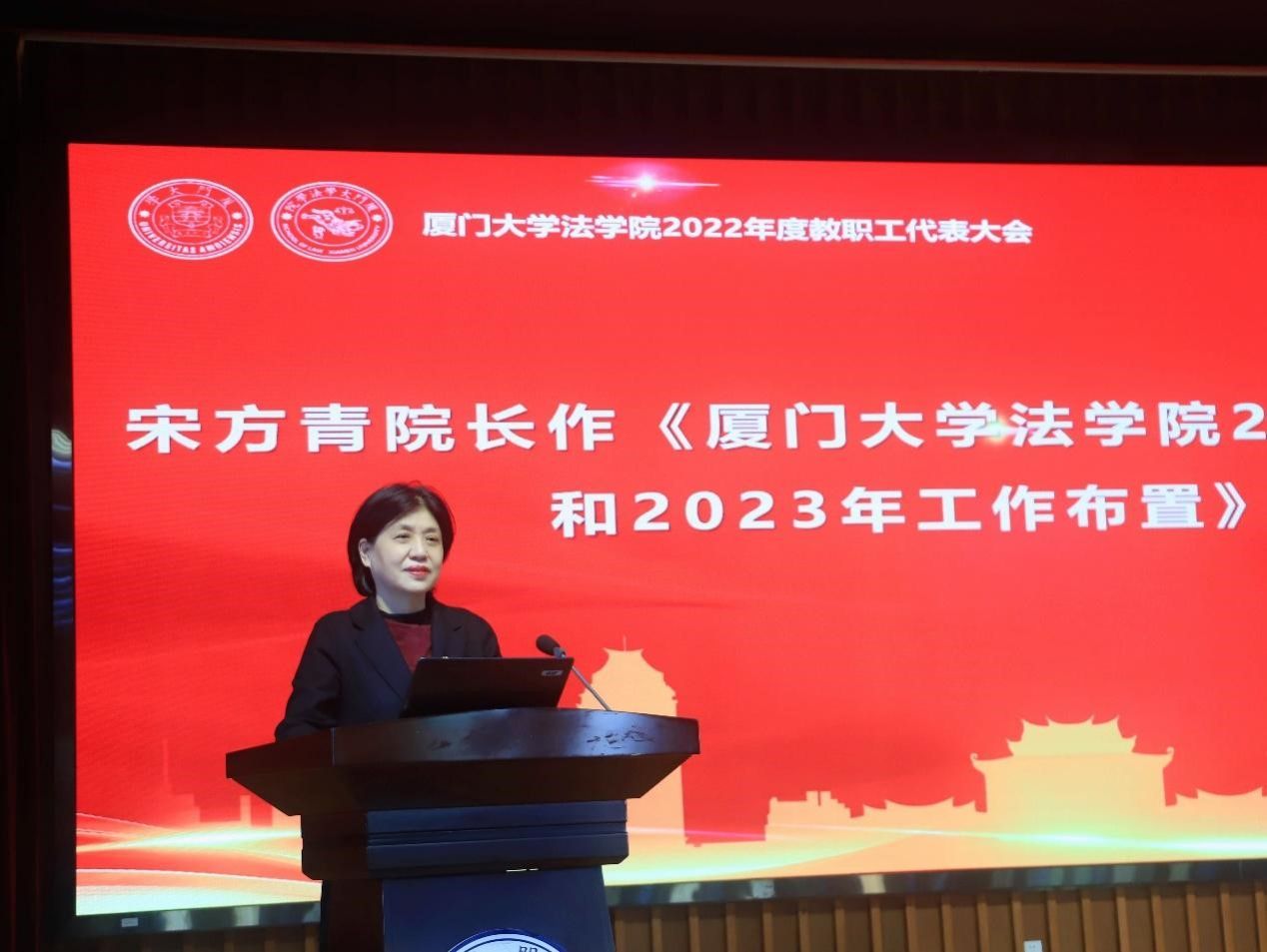 接下来,宋方青院长作法学院2022年度工作总结和2023年度工作布置。报告共分为三个部分,第一部分是学院党建工作。宋院长从基层党建、二十大学习、课程思政教育、师德师风建设等方面对上一年度学院党建工作进行总结。她强调,学院党委将充分发挥政治“指南针”作用,以党的二十大精神为指引,以一流的党建引领一流学院建设。第二部分是法学院行政工作,宋院长从人才培养、人才队伍建设、科学研究、对外交流与合作、社会服务、财务情况、教学环境六个方面对行政工作进行总结,详细展示了上一年度学院取得的各项成绩。第三部分宋院长传达了2023年学校工作布置要点并布置了2023年学院工作重点。她希望全院上下能够勠力同心,笃行不怠,全力开创学院事业发展新局面。