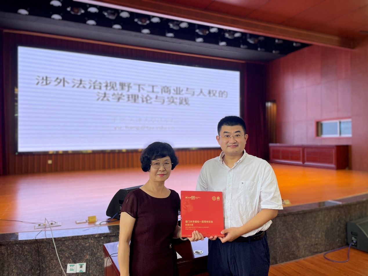 于亮老师精彩的讲座内容丰富、议题新颖,给在座的同学不少启发,展示了工商业与人权领域最前沿的研究成果。讲座结束后于飞教授代表国际法学科向于亮老师赠送了厦门大学百年校庆纪念邮票,对于亮老师的精彩讲座表示衷心感谢,并期待校友常回母校交流。