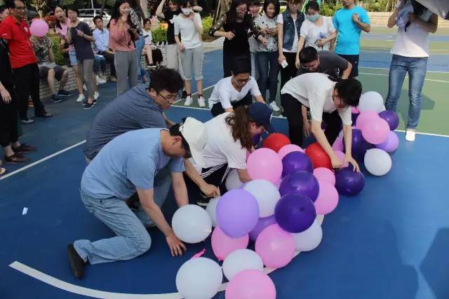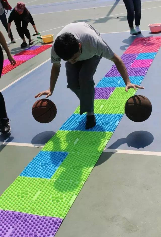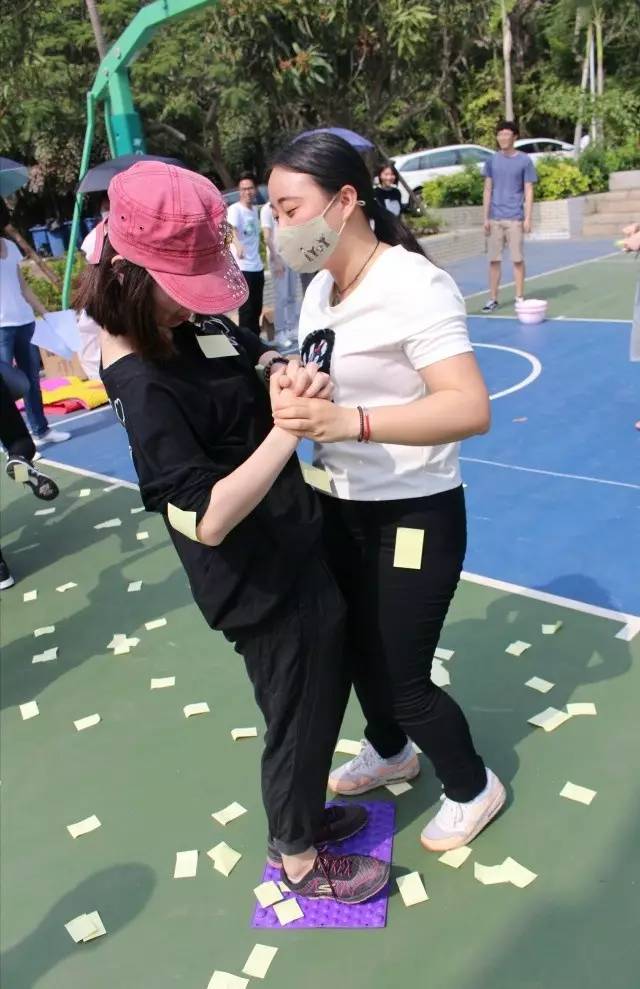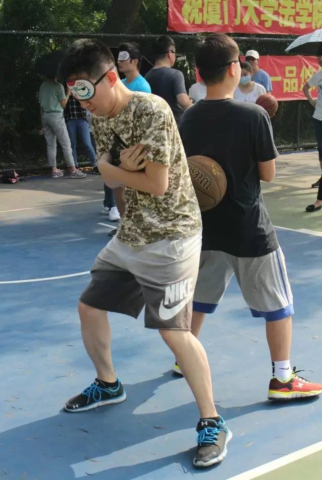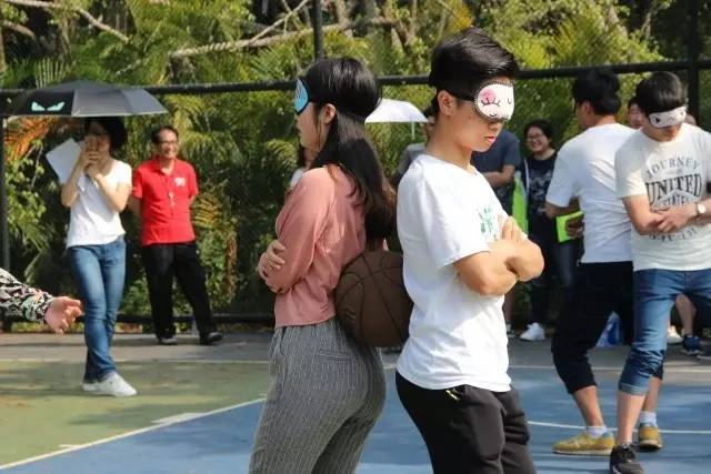 眼看“郑派”先拔头筹,群雄嘶吼,怎甘落后?第三战,可谓偷梁换柱、暗度陈仓,须得各路人马蒙目摸黑押运军火(戴眼罩背靠背运送篮球),送抵后稍作休整(蒙眼喂糖),而后千里之外,一发天雷鬼火神龙炮,正中敌营后方(罚球线投篮命中),正是传说中的“‘喂’你投篮”!