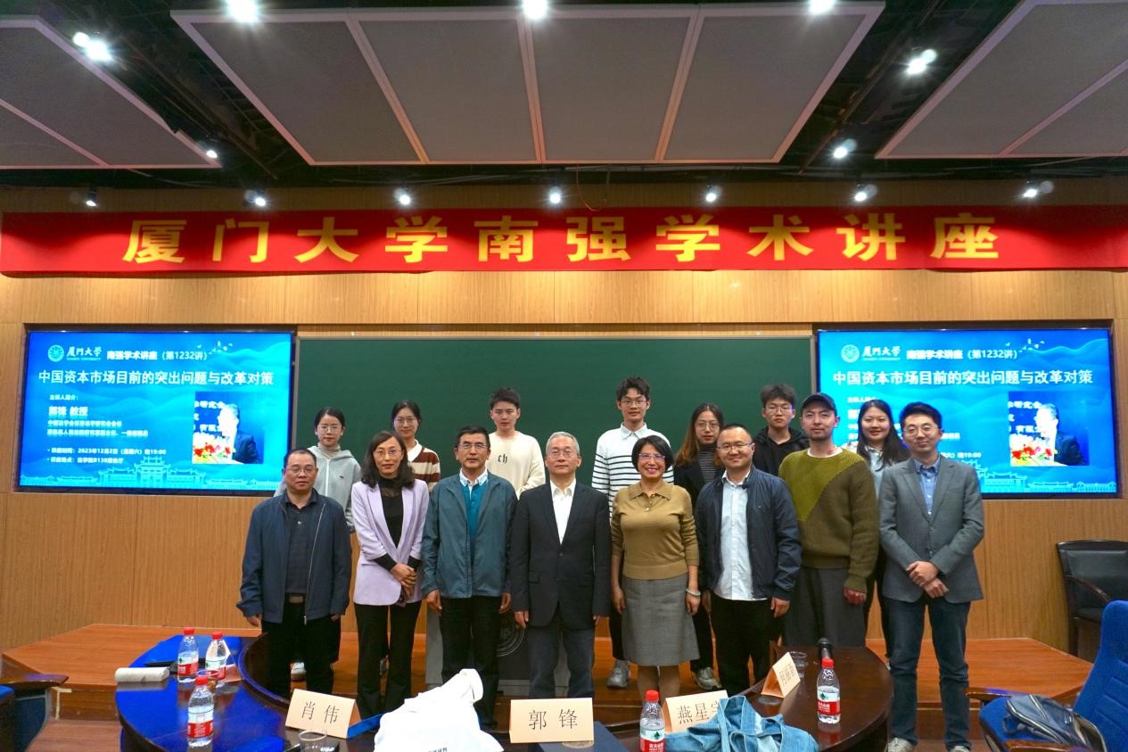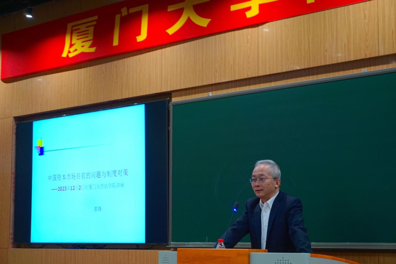 2023年12月2日晚,南强学术讲座第1232讲在厦门大学法学院B138报告厅举行。本次讲座特邀中国法学会证券法学研究会会长郭锋教授为主讲人,主题是“中国资本市场目前的突出问题与改革对策”。郭锋教授现任中国法学会证券法学研究会会长,原最高人民法院研究室副主任、一级巡视员。郭锋教授曾先后任中国人民大学法学院教授,中央财经大学法学院院长、教授,最高法院研究室副主任暨民法典贯彻实施工作领导小组办公室副主任。郭锋教授还是《民法典》起草工作组成员,《证券法》《公司法》《票据法》等立法起草人,最高法院《民法典》配套司法解释具体负责人。厦门大学法学院党委书记何丽新教授莅临本次讲座。厦门大学法学院肖伟教授担任主持人,阳建勋教授,毛海栋、李天相、燕星宇助理教授也参加了这次讲座。厦门大学学生80余人在场聆听。