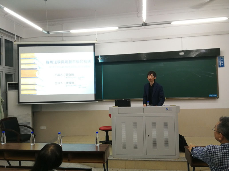 2018年11月10日晚7点半,澳门大学法学院高级讲师吴奇琦博士做客我院,讲授“罗马法学与希腊哲学的相遇:民法上的substantia与essentia理论”,讲座由徐国栋教授主持,出席讲座的还有日本北九州大学法学部教授矢泽久纯、我院毕业生、重庆大学法学院讲师谢潇博士以及来自广东的宗华律师,部分博士生、硕士生以及本科生也参加了此次讲座。