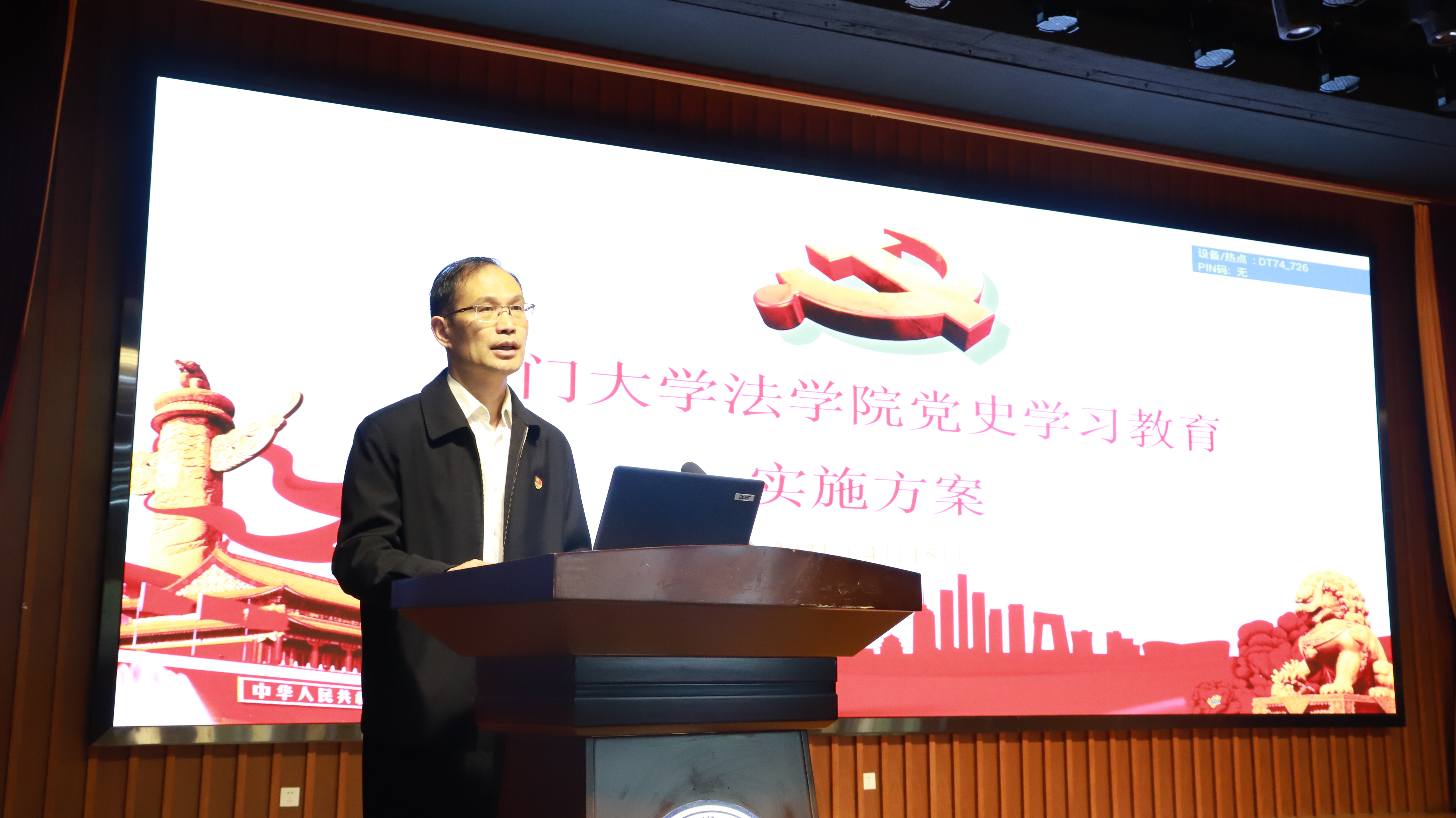 法学院党委副书记郭锦星介绍了《法学院党史学习教育实施方案》,围绕目标要求、学习内容、进度安排、重点任务、组织领导五方面,深入解读了法学院党史学习教育方案。同时,学院还成立了“厦门大学法学院党史学习教育宣讲团”,由许和山书记任宣讲团团长。