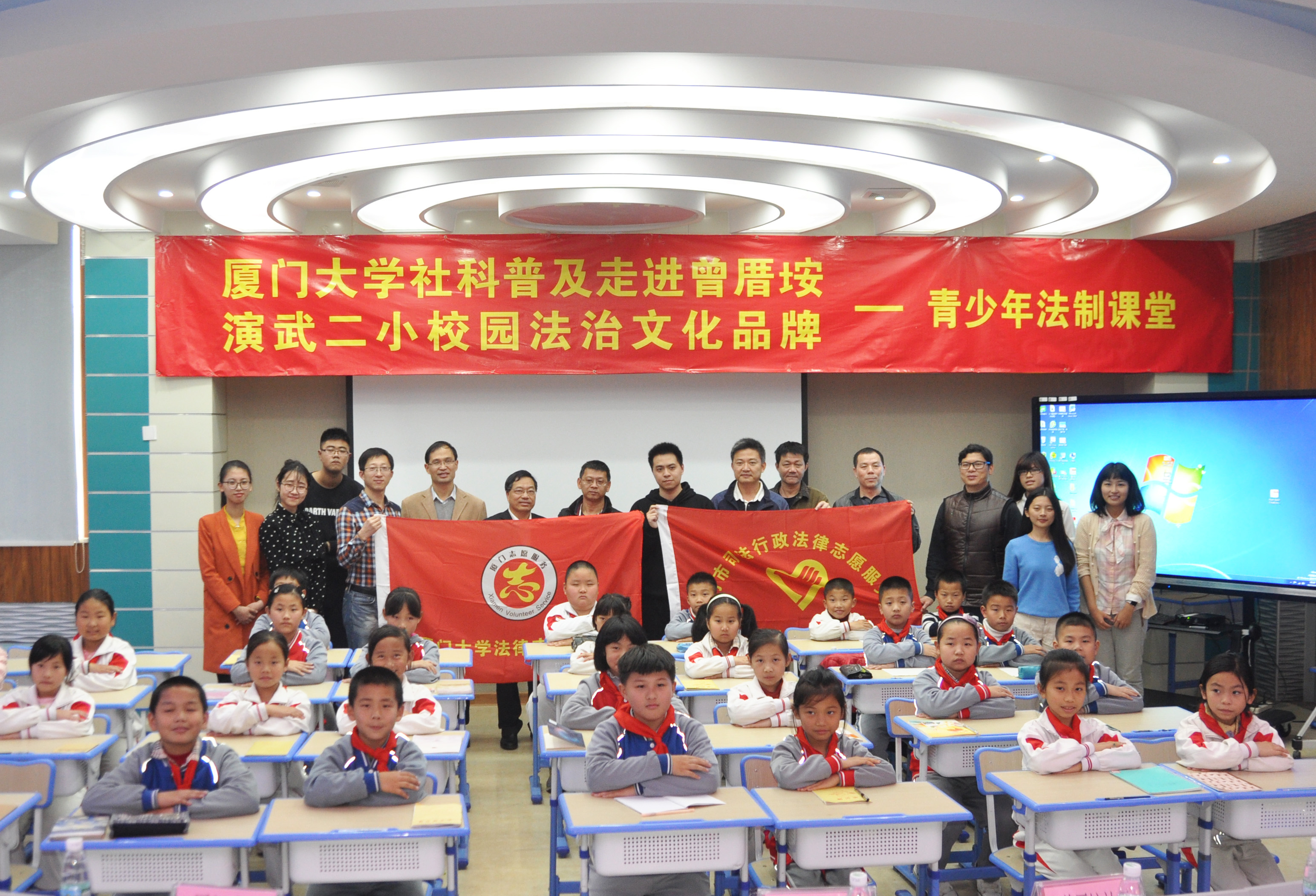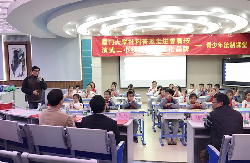 3月13日下午,由校社科处、法学院及厦门市思明区滨海司法所、曾厝垵社区及演武第二小学共同主办的“厦门大学社科普及走进曾厝垵——演武二小青少年法制课堂”开幕仪式在厦门市第二演武小学多媒体教室启动。厦门大学社科处副处长林木顺、法学院党委副书记郭锦星、法学院团委书记高斌、厦门市思明区滨海司法所所长朱毅平、曾厝垵社区党委书记黄清杰、厦门市演武第二小学校长陈国勇等出席仪式。