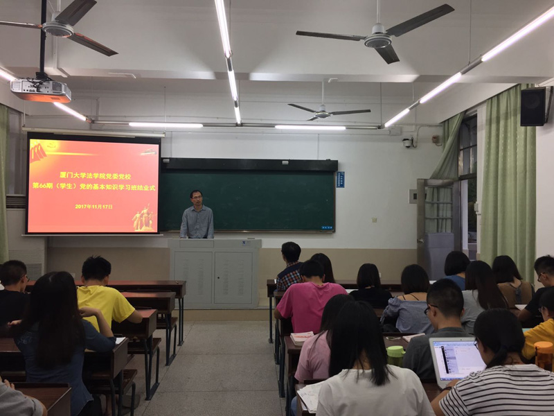 2017年11月17日下午,厦门大学党委党校第66期(学生)党的基本知识学习班(法学院专场)结业式在法学院A204顺利举行。法学院党委副书记郭锦星老师、法学院团委书记高斌老师出席了结业式。结业式由法学院党务秘书吴荻老师老师主持。
