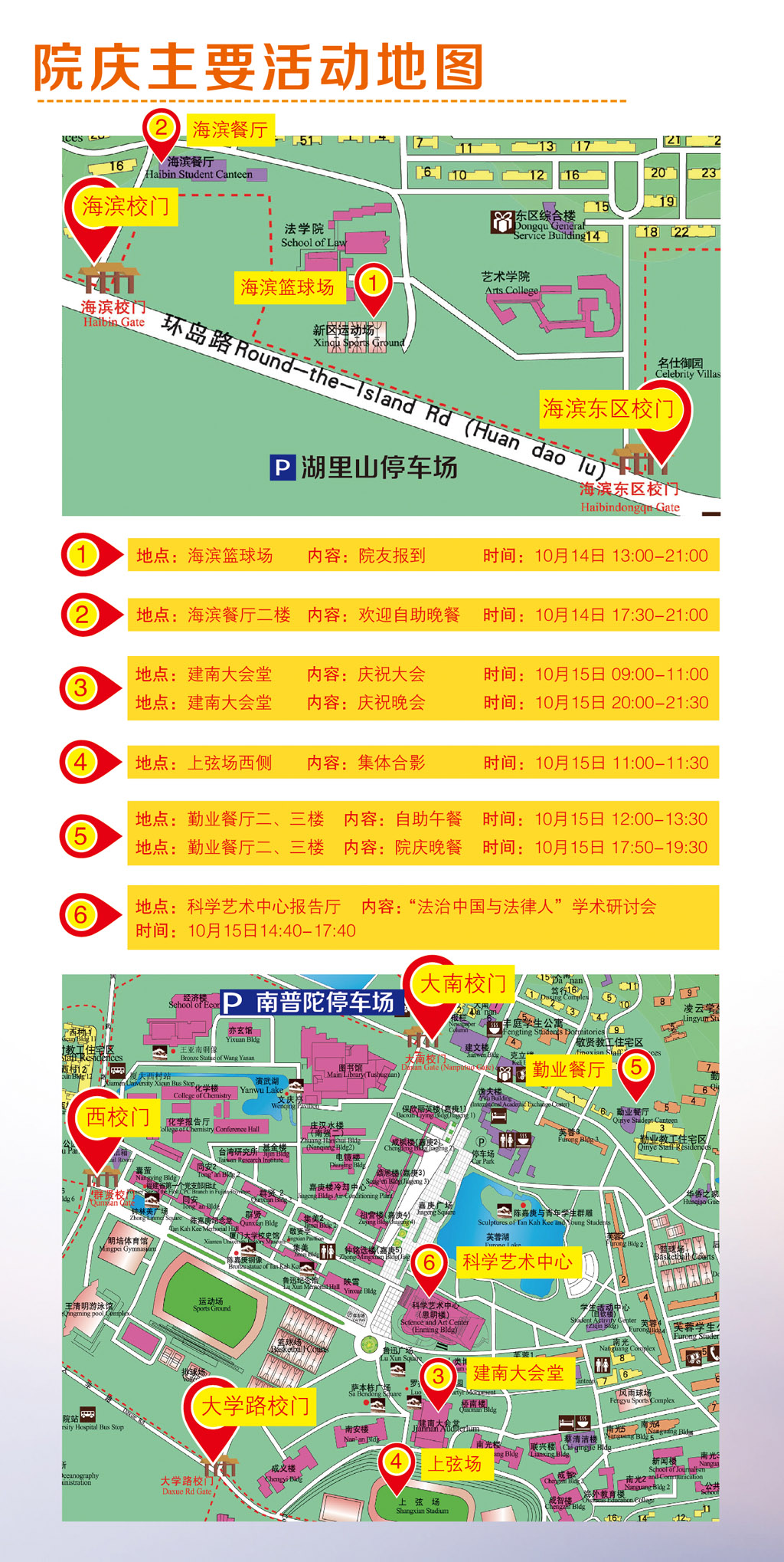 - 因校园人流大、车辆多,尤其是法学院周边没有停车位,为避免交通拥堵,维持良好的校园秩序,请院友选乘公共交通或出租车至校门口后步行入校。自驾院友可将车辆10月14日停至胡里山停车场。10月15日可停至南普陀地下停车场,恳请院友们理解和支持!