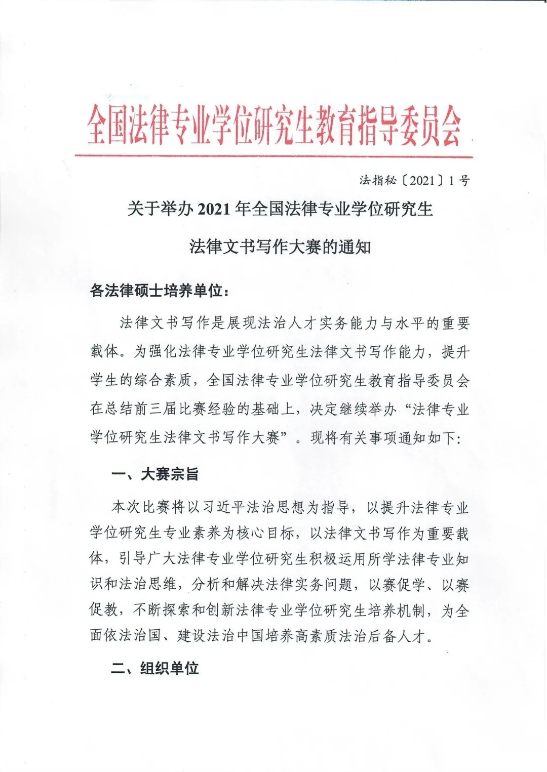 法律文书写作是展现法治人才实务能力与水平的重要载体。为强化法律专业学位研究生法律文书写作能力,提升学生的综合素质,全国法律专业学位研究生教育指导委员会在总结前三届比赛经验的基础上,决定继续举办“法律专业学位研究生法律文书写作大赛”。现将有关事项通知如下: