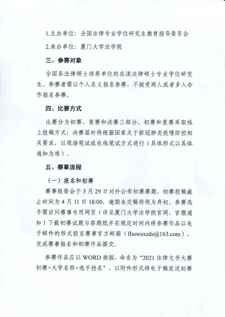 赛事组委会于3月29日对外公布初赛赛题,初赛投稿截止时间为4月11日18:00,逾期未交稿将视为弃权。参赛选手需访问赛事专用网页(详见厦门大学法学院官网、官微通知)下载初赛试题与答题纸并在规定时间内将参赛作品以电子邮件的形式投至赛事官方邮箱(flsswsxzds@163.com),完成赛事报名和初赛作品提交。