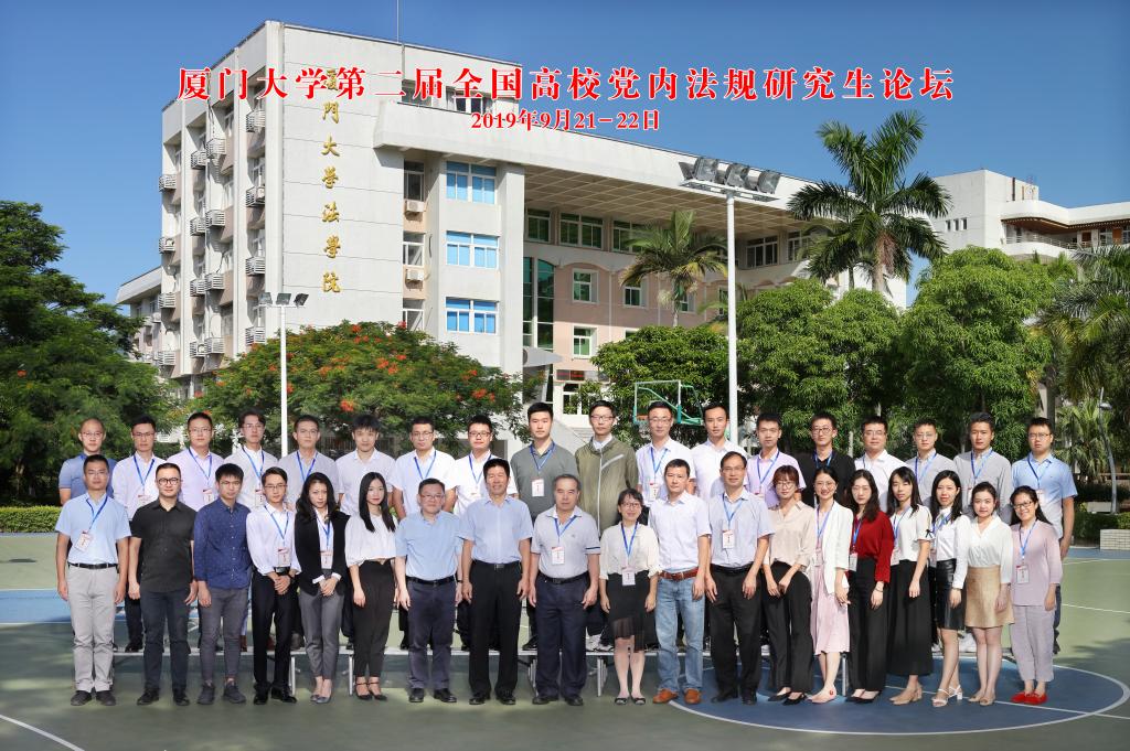 夏色未艾,秋景方兴,群贤毕至,少长咸集。2019年9月21日至22日,“厦门大学第二届全国高校党内法规研究生论坛”在法学院B138会议室成功举办。本次论坛由厦门大学党内法规研究中心、厦门大学法学院主办,由厦门大学党规党纪学生研习社承办。论坛旨在推进党内法规理论创新、学科建设和人才培养,完善党内法规制度体系,是厦门大学法学院“不忘初心、牢记使命”主题教育的重要活动,也是该院新生党员教育的重要环节。来自全国近二十所知名高校、科研机构的三十余名博、硕士研究生参与论坛。厦门大学纪律检查委员会副书记林金枝、党委党的建设工作办公室主任廖志丹,法学院党委书记许和山、院党委副书记郭锦星、副院长郑晓剑、院团委书记陈国渊和副书记杨璐,厦门大学党内法规研究中心副主任王云清,福建天衡律师事务所合伙人白劭翔、陈力舟和相关专业教师代表以及厦门大学党规党纪学生研习社骨干成员、法学院2019级新生党员同学等参加论坛。