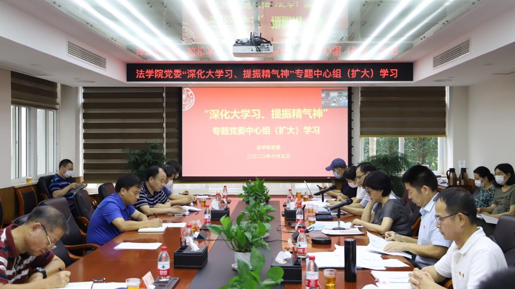 2020年6月5日下午,法学院党委中心组(扩大)开展“深化大学习、提振精气神”专题学习。校党委常委、组织部部长孙理,校党委第四巡察组组长张建安、副组长黄田、成员房太伟,校党委党校副校长何丽新,校社科处处长高和荣应邀观摩指导。会议由法学院院长宋方青主持,学院党委中心组成员、教职工党支部书记、党政管理干部及辅导员参加了此次学习。