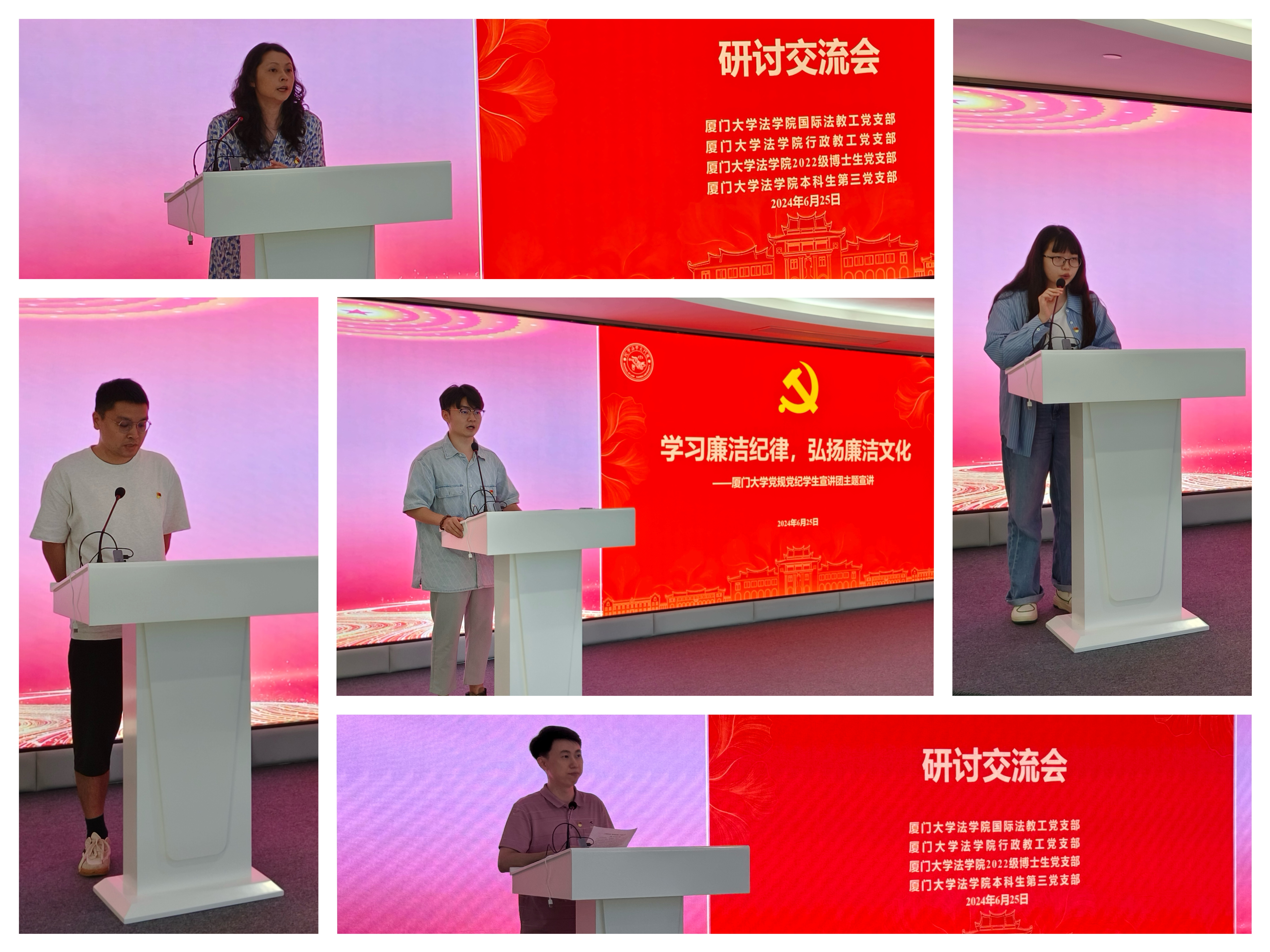 厦门大学党规党纪学生宣讲团成员、法学院2023级硕士研究生张云壹结合党纪学习教育,为师生党员作《学习廉洁纪律,弘扬廉洁文化》主题宣讲,倡导弘扬廉洁文化,笃行廉洁纪律,永葆共产党人清正廉洁的政治本色。国际法教工党支部书记陈欣副教授、行政教工党支部上官仪、2022级博士生党支部蒋昊禹、本科生第三党支部杨佳佳等作重点发言,分享实践教学活动体会。与会师生党员纷纷表示,要从习近平总书记的思考和探索中,汲取政治力量、思想力量、行动力量,激励自己不懈奋斗,把对总书记的深厚爱戴之情转化为干事创业的强大动力,努力在推动一流法学学科建设中展现更大担当和作为。