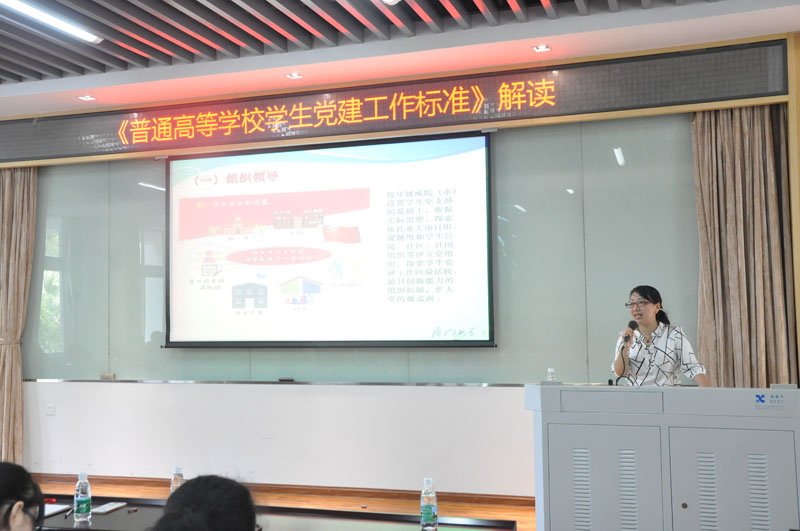 廖志丹同志从《普通高等学校学生党建工作标准》制定的意义、依据、编制的原则以及主要内容等方面展开叙述,结合学生党建工作实际详细解读了《标准》中的工作指标,具体列举了党员发展工作中易出现的程序问题,党员发展材料中常出现的不规范问题,指出理论联系实际的重要性。她还讲述了在台风“莫兰蒂”灾后重建工作中的故事,各级党委发挥的先锋作用,展示了各学院日常学生党建工作中的创新之处,鼓励法学院学生党建工作进行更多的创新和探索。