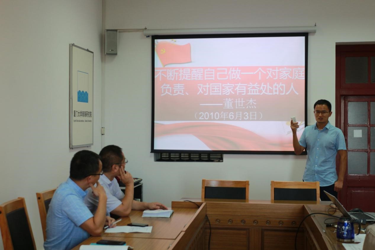 2019年9月25日下午3时,南海研究院教工党支部成员齐聚南安楼215会议室,开展固定党日+活动。本期的活动主题是“当初入党为什么”分享交流会。“当初入党为什么”,这是一个根本的动因问题,在中华人民共和国成立70周年即将来临之际,作为共产党员,我们深感本次主题的神圣涵义。提前一周,党支部已通知各位同志将自己的入党初衷凝练为一句话,结合自己的入党经历,向支部做三分钟左右的分享。