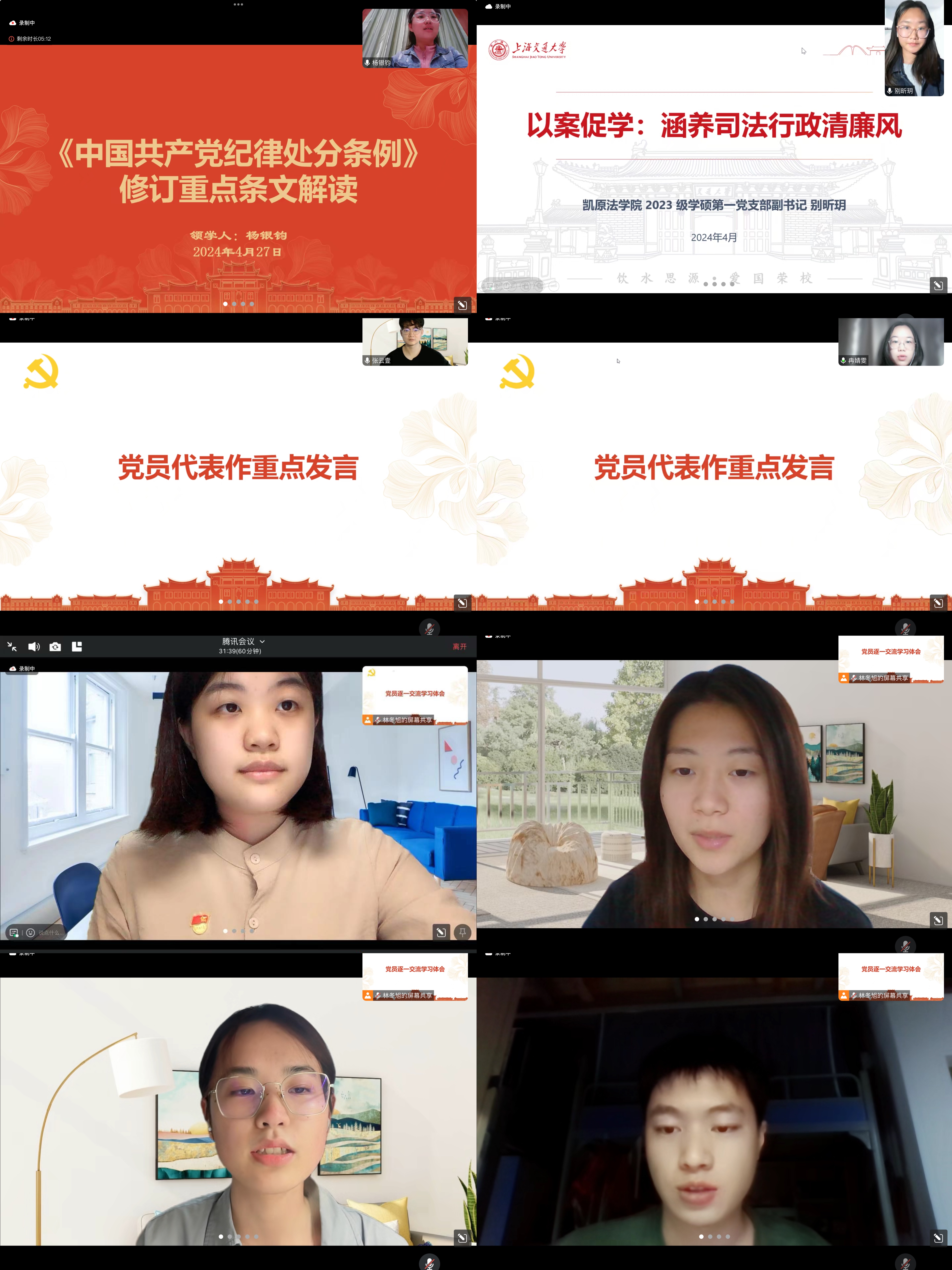 为深入贯彻落实习近平总书记关于党纪学习教育的重要讲话和重要指示精神,进一步增强党员干部的纪律意识和规矩意识,4月27日下午,厦门大学法学院2023级法学硕士生第一党支部、厦门大学党规党纪学生研习社党支部与上海交通大学凯原法学院学硕第一党支部通过线上方式开展党纪学习教育联学共建活动。活动由厦门大学法学院2023级法学硕士生第一党支部书记、党规党纪学生研习社副社长林冬旭主持。