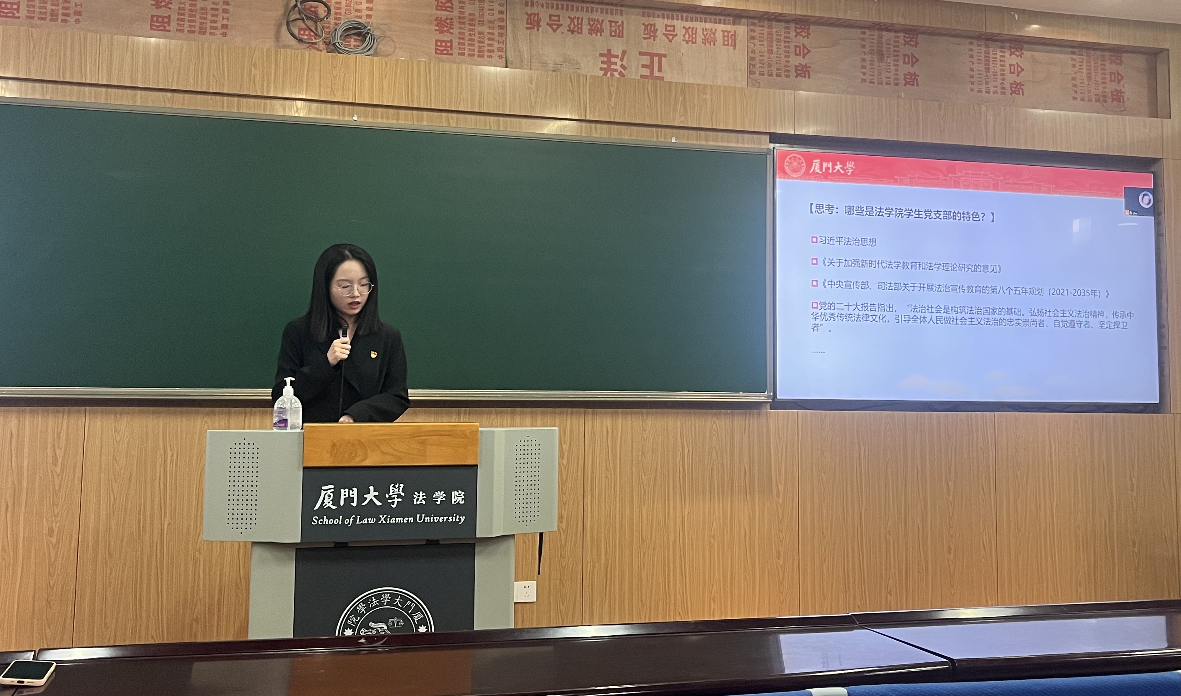 会议首先由厦门大学党规党纪学生研习社社长吴卉轩分享研习社党支部关于“立项活动”的经验和思考。她从什么是党支部立项活动入手,介绍了研习社党支部立项情况,总结了立好项的三点经验:找准中心、精心实施、认真总结,努力创建“法学+党建”特色品牌,为各支部的党建活动、样板支部建设提供了思路借鉴。
