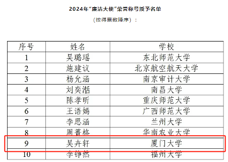 2024年6月,经个人申请,组织推荐,资格审查与投票评审,由中国管理现代化研究会廉政分会、全国大学生廉洁社团网络、东北师范大学政法学院联合主办的2023年廉洁大使评选结果公布,厦门大学法学院吴卉轩同学荣获2024年“廉洁大使”荣誉称号。