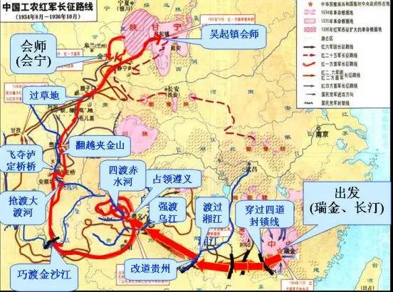 瑞金→突破敌四道防线→强渡乌江→占领遵义→四渡赤水→巧渡金沙江→强渡大渡河→飞夺泸定桥→翻雪山→过草地→陕北吴起会师(1935年10月)→甘肃会宁会师(1936年10月9日)→宁夏西吉县将台堡会师(1936年10月22日)