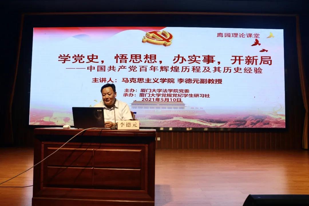 学史明理、学史增信、学史崇德、学史力行。为扎实推进党史学习教育,坚定信仰,以知促行,5月10日晚,学院在模拟法庭举办“中国共产党百年辉煌历程及其历史经验”专题党课。专题党课由法学院党委主办、厦门大学党规党纪学生研习社党支部承办,马克思主义学院李德元副教授担任主讲人,法学院党委副书记郭锦星和全体研究生党员共同聆听这场专题党课。