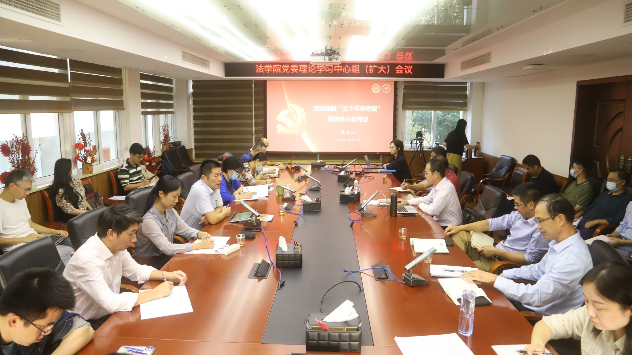 10月20日下午,法学院党委在法学院B220召开理论学习中心组(扩大)会议,通过提前自学、集体学习、交流研讨等形式,深入学习党的二十大精神。会议由党委副书记郭锦星主持。
