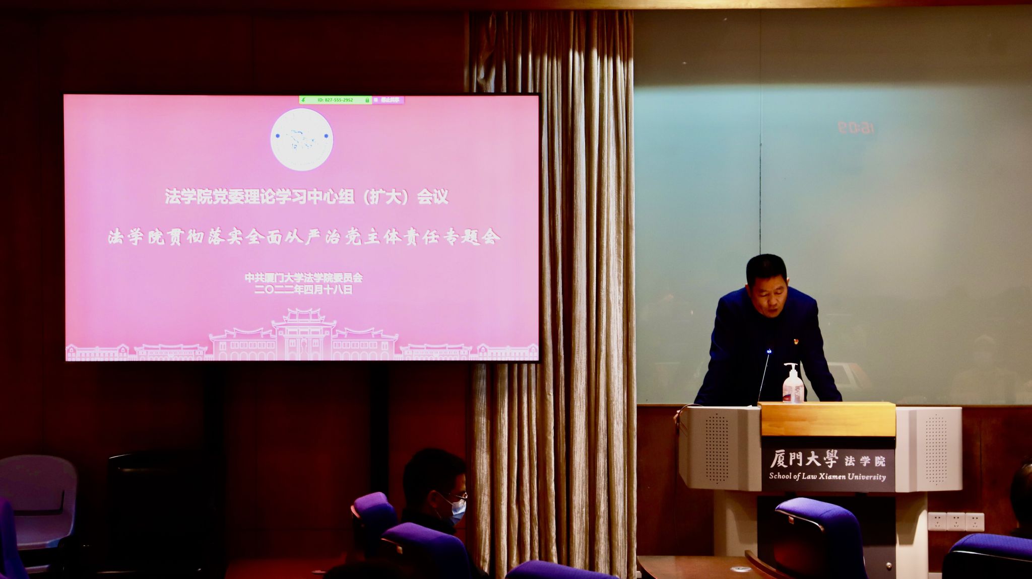 2022年4月18日下午,法学院召开党委理论学习中心组(扩大)会议暨贯彻落实全面从严治党主体责任专题会,传达学习“厦门大学2022年落实全面从严治党主体责任座谈会”精神,研究部署法学院贯彻落实举措。法学院党建工作联络员林永生到会指导,法学院党政领导班子、教工党支部书记、学生党支部书记、科级及以上党政管理干部、辅导员参加会议。会议由学院党委书记许和山主持。