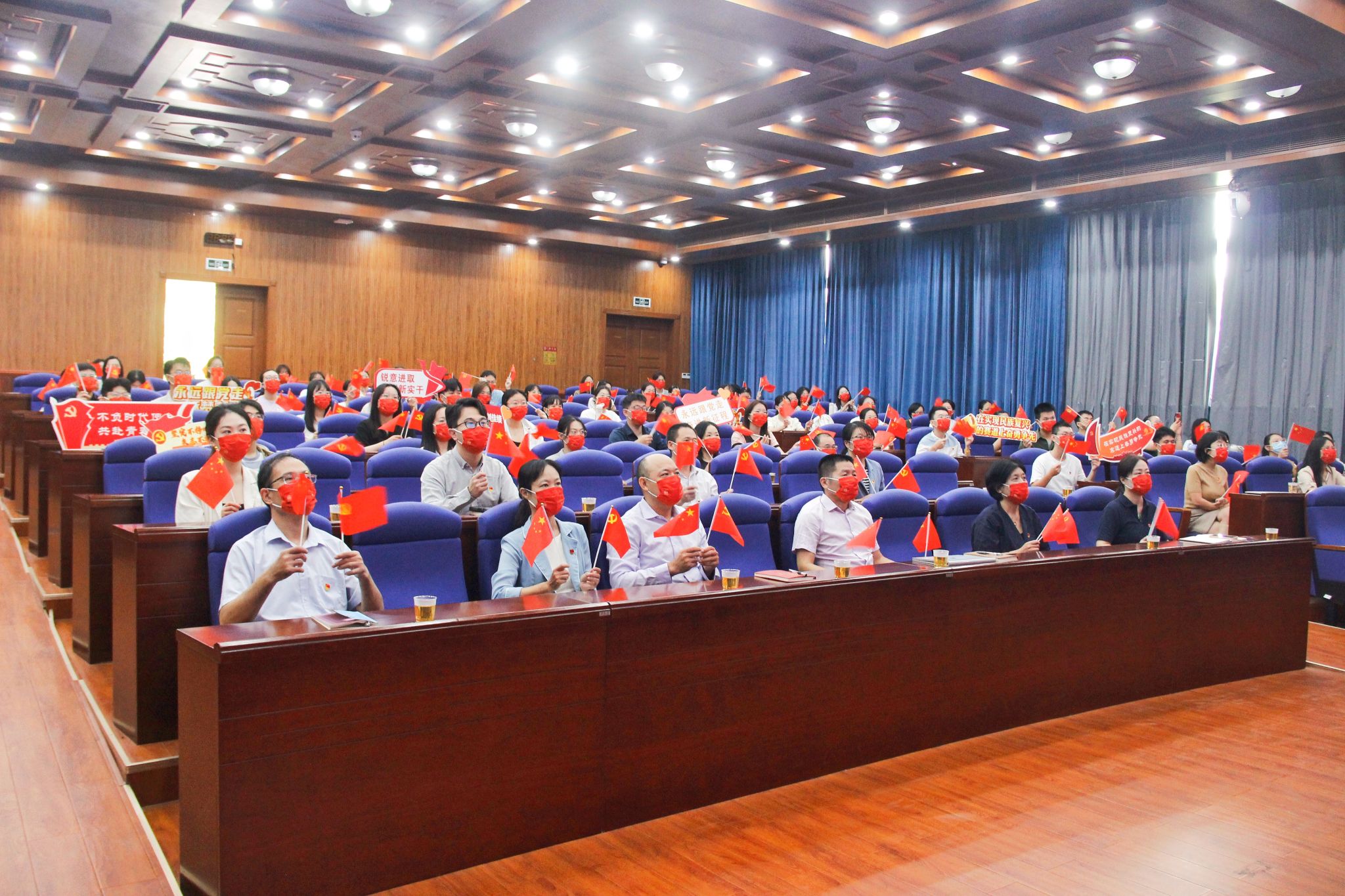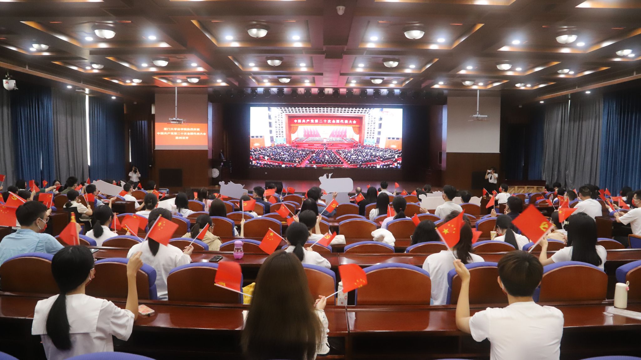党的二十大是在迈上全面建设社会主义现代化国家新征程、向第二个百年奋斗目标进军的关键时刻召开的一次十分重要的大会。正式开幕前,与会师生挥舞着手中的国旗和党旗,高举奋进标语,满怀期待。