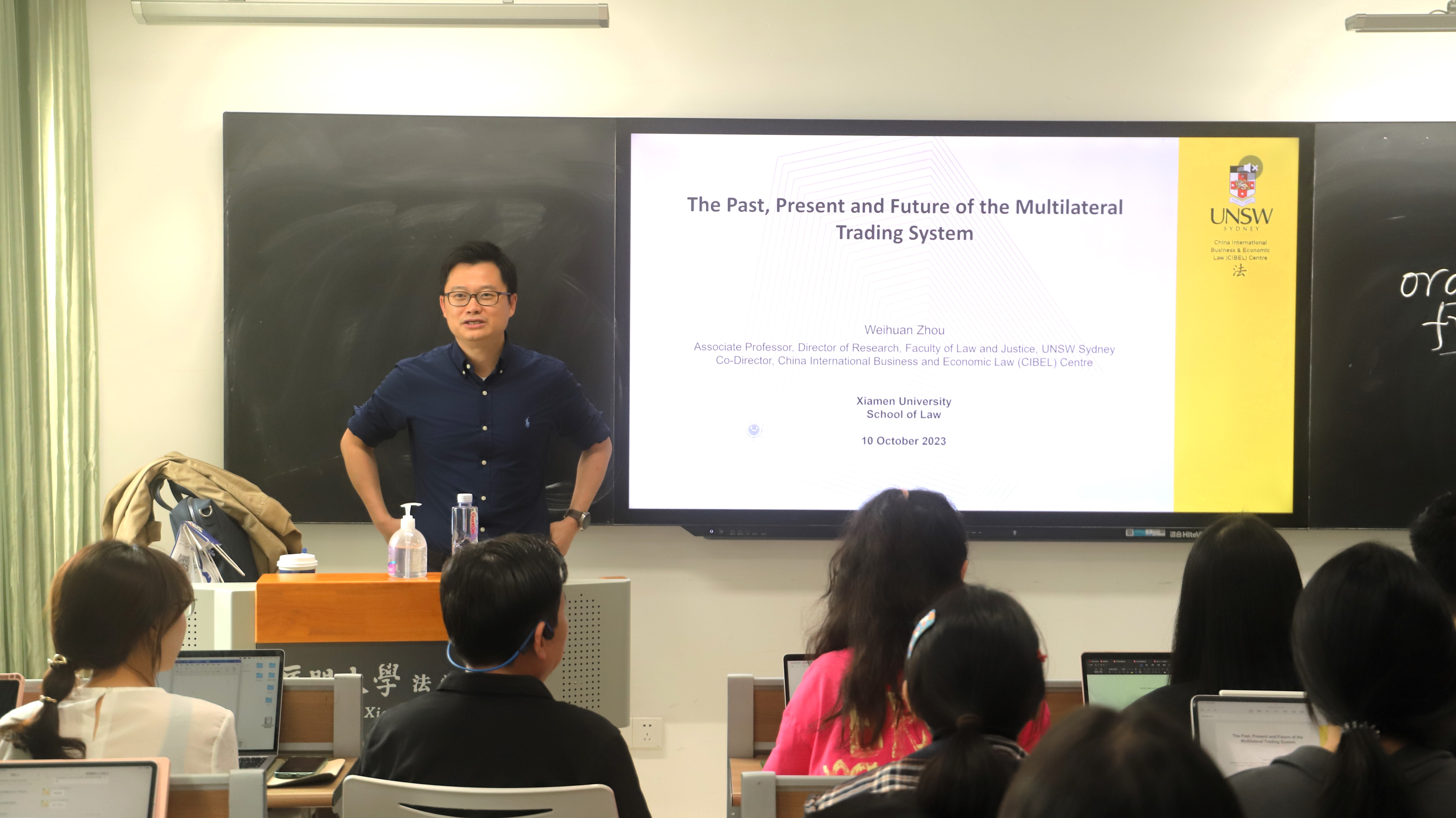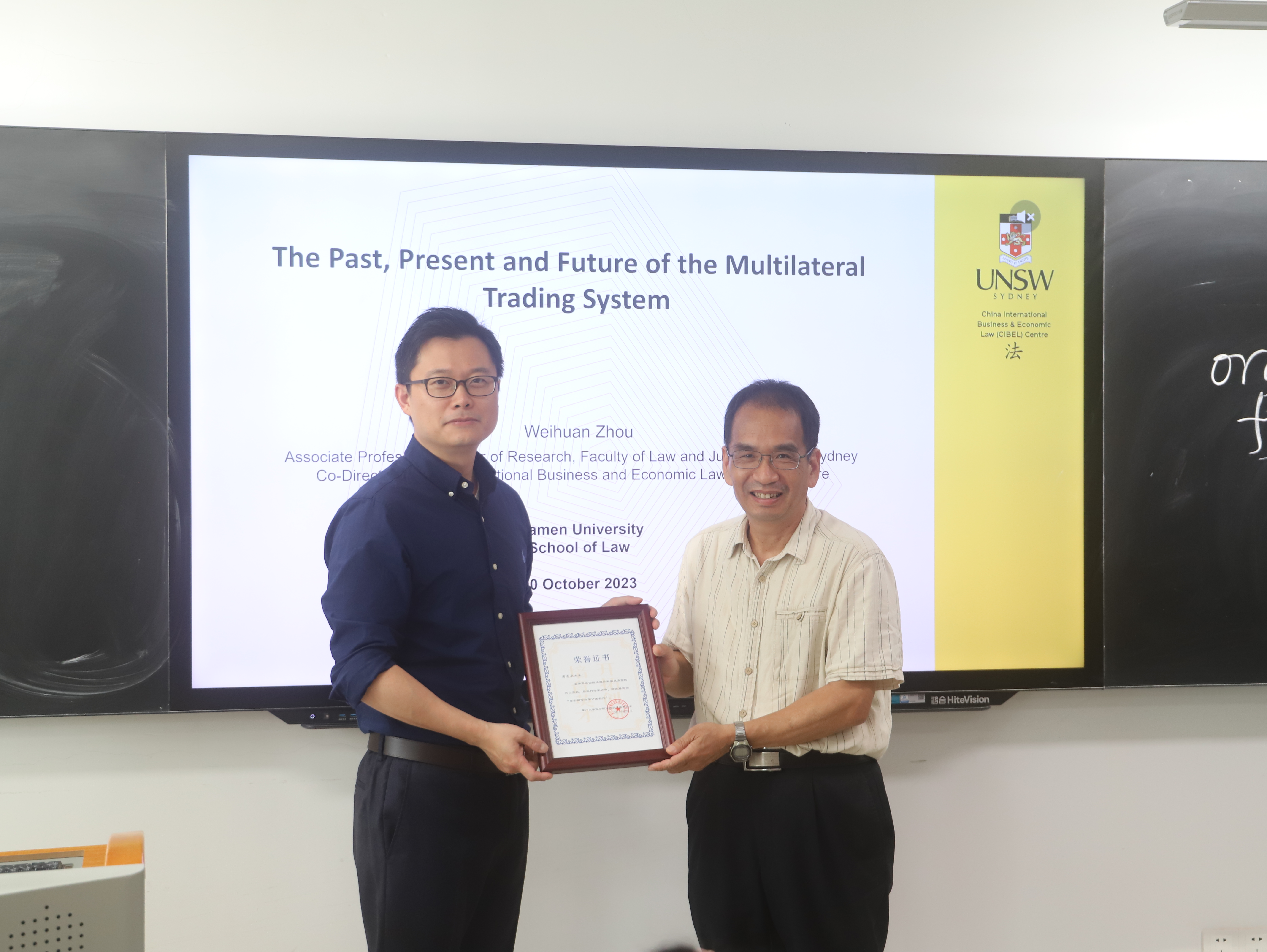 2023年10月10-13日,澳大利亚新南威尔士大学法学院副教授、研究事务主任,中国国际商法与国际经济法中心联席主任周围欢博士作为本年度“陈安国际法学讲座教授”莅临我院开展系列学术讲座,中国国际经济法学会副会长、厦门大学陈安国际法学发展基金会理事长徐崇利教授为周围欢博士颁发了荣誉聘书。
