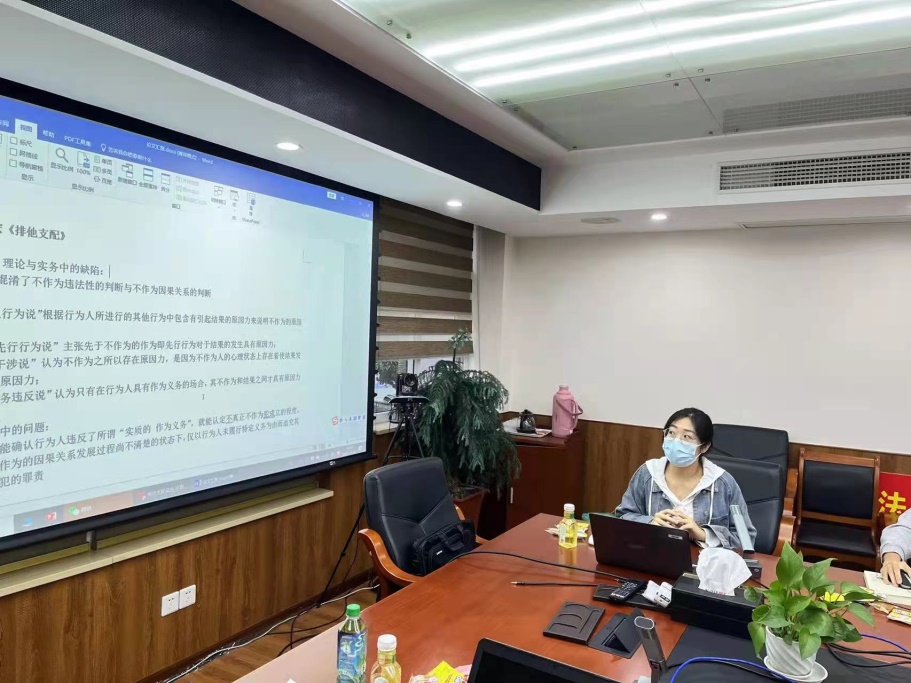 在会议的下半场,同学们继续就不作为犯和过失犯中的因果关系问题进行了讨论。其中,王欢同学分享了一些学者关于不作为犯的解构思路和建构理论,对传统的学说尤其是期待说谈了自己的看法。她认为不作为犯因果关系的重点在于不作为犯与作为犯的区别和等价性判断上,要注意二者的不同构造和表现形式,同时不能忽略因果关系判断的实质是事实判断在先、法律评价在后。除此之外,在行为归责的基础上,王欢同学也对过失犯的规范归责问题进行了汇报。