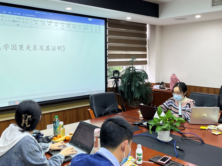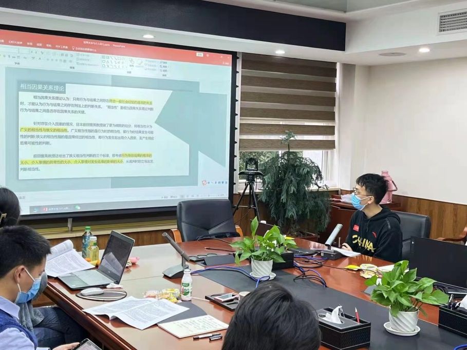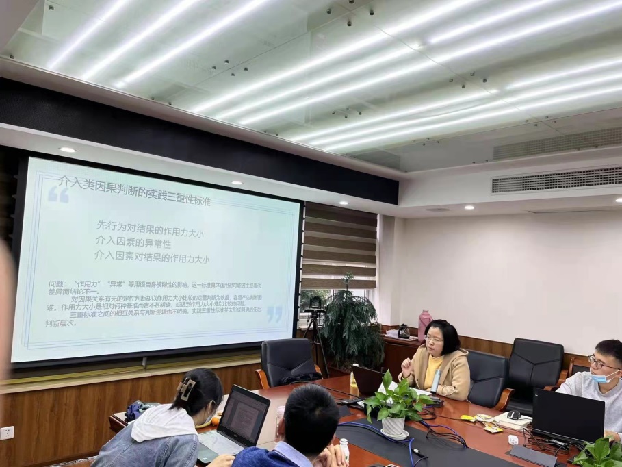 在基本理论部分,王千慧同学就大陆法系的因果关系理论与英美法系的因果关系理论进行了简要介绍,并就假定因果关系与结果避免可能性的区分问题发表了自己的看法。她认为,我们应当在明确论述立足点是归因问题还是归责问题的前提之下,再对假定因果关系与结果避免可能性之间的区别标准乃至其他因果关系问题进行探讨,否则容易出现标准冗杂、逻辑错位等问题。紧接着,王飞宇同学就疫学因果关系的判断做了简要汇报,向同学们详细介绍了美国的一般因和特别因的理论,以及希尔标准的运用。