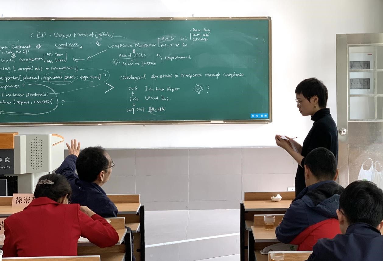 2022年12月7日,由郑晓欧助理教授以《The Issue of Compliance with the MEAs from an Interstate Perspective》为题进行报告。郑老师汇报的关注点在于环境法与人权法间的关联性,她认为已有的前提是两者有着互相促进的目标,继而在此语境下探讨两者在履约方面的关系。