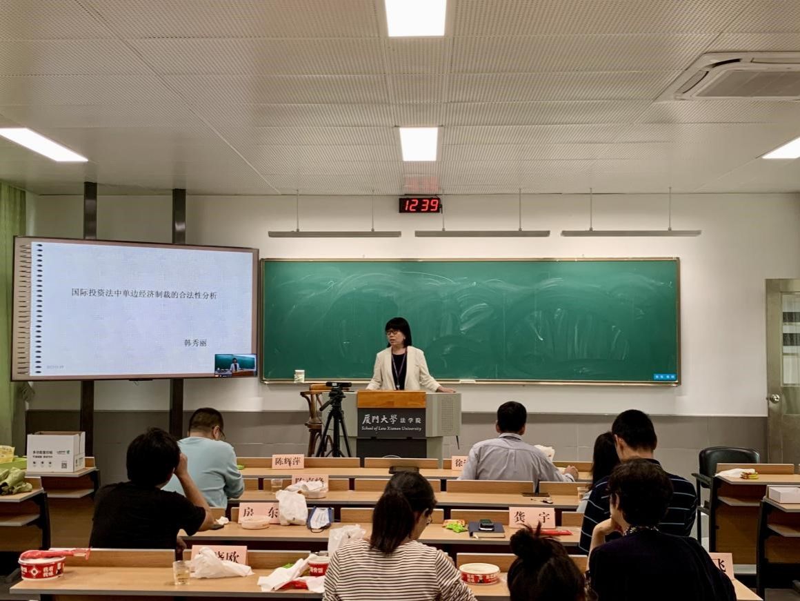 2022年11月23日、11月30日,学期第四次、第五次午餐会由韩秀丽教授主讲,韩教授以《国际投资法中单边经济制裁的合法性分析》为题,从单边制裁的性质、争端解决路径、合法性标准及合法性抗辩为框架内展开论述。其认为相对于联合国安理会决议授权的多边经济制裁,国际投资法中的单边经济制裁的合法性具有不确定性。