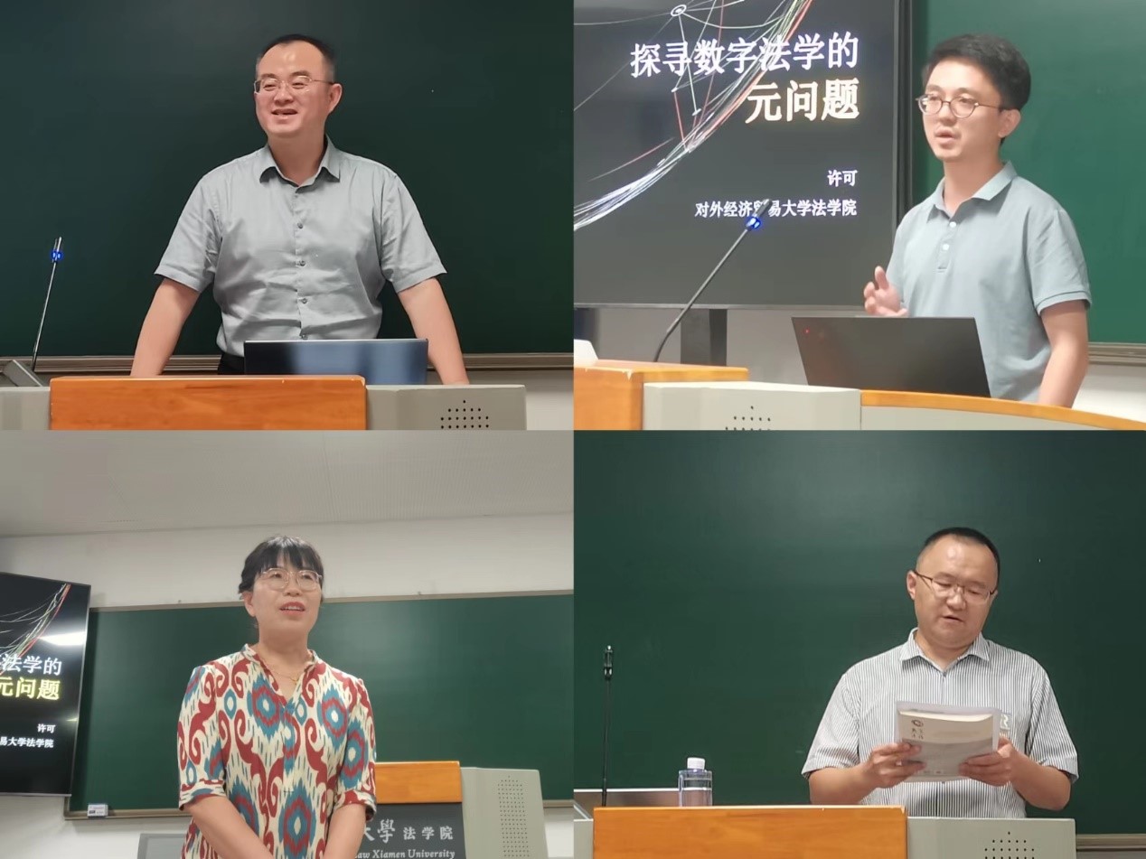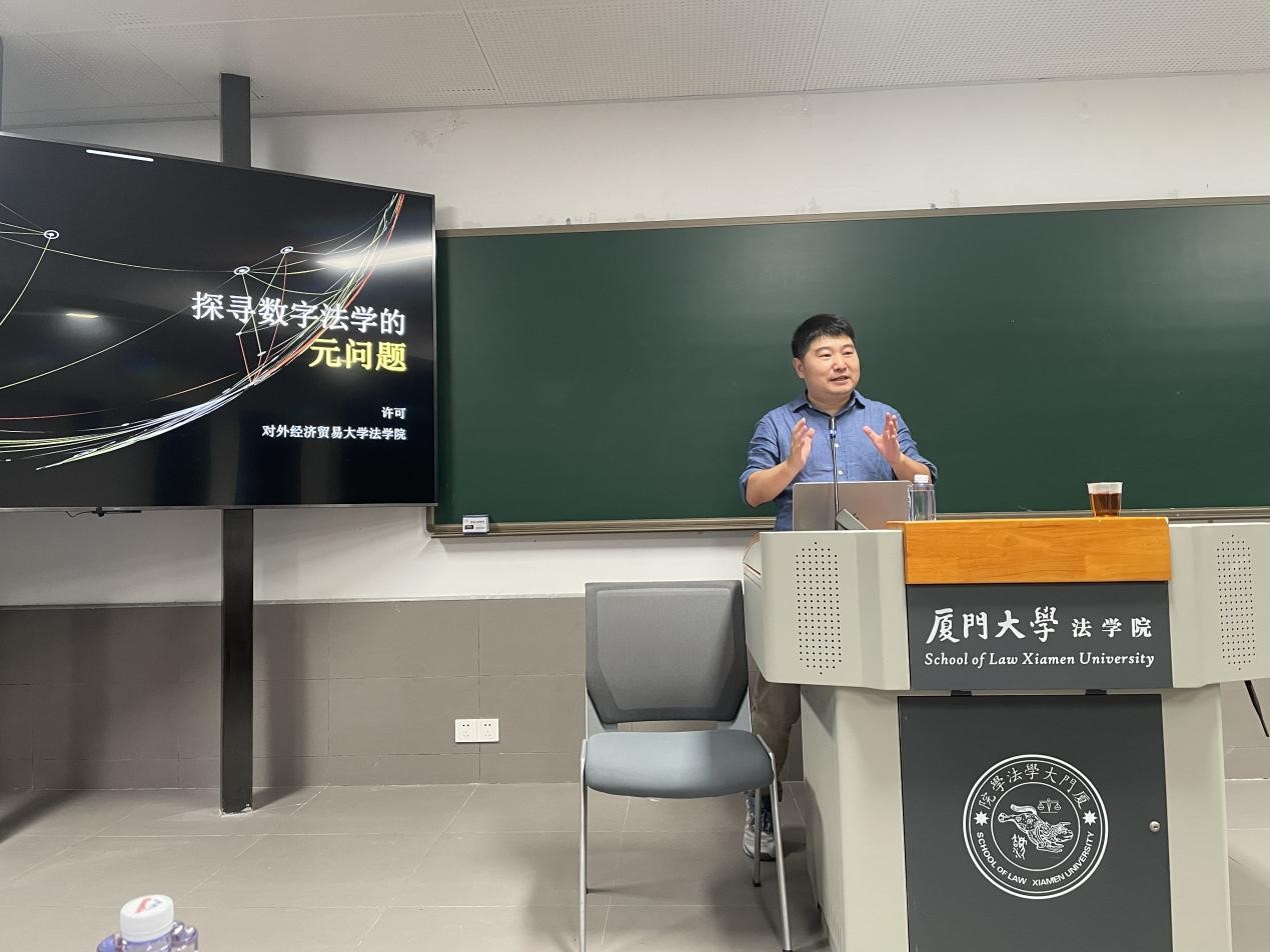 2024年9月30日晚,由厦门大学法学院法与政治经济学研究中心主办的“法律与政治经济系列讲座”第五期在法学院A304教室顺利举行。本期讲座由对外经济贸易大学法学院数字经济与法律创新研究中心主任许可副教授主讲《探寻中国数字法学的元问题》,厦门大学法学院的多位老师、北京盈科(厦门)律师事务所的张有为执行主任和陈茹靖律师以及数十位同学参加了本次讲座。讲座由毛海栋老师主持。