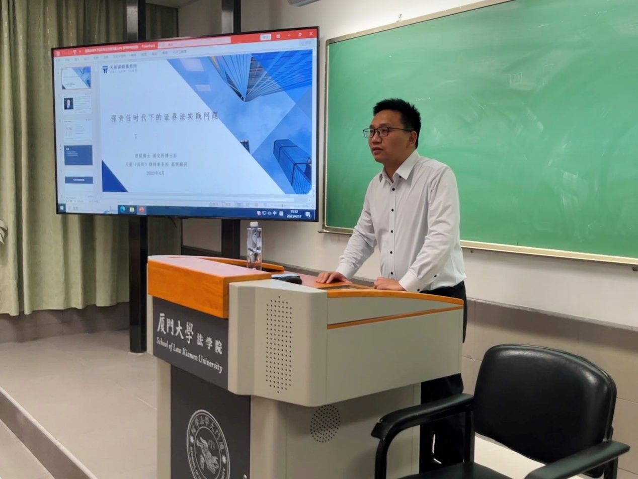 2023年4月17日晚,由厦门大学法学院法与政治经济学研究中心主办的“法律与政治经济系列讲座”第二期在法学院A101教室顺利举行。受法与政治经济学研究中心主任毛海栋老师邀请,浙江天册(深圳)律师事务所高级顾问曾斌博士做了题为“强责任时代下的证券法实践问题”的讲座,法学院几十余位学生以及来自盈科厦门等律所的数位律师参加了本次讲座。