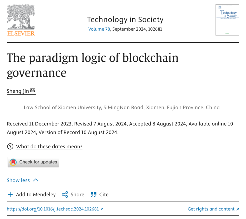 近日,厦门大学金融法研究中心2022级博士生金晟同学撰写并独立署名的The paradigm logic of blockchain governance一文在SSCI顶刊Technology in Society第78卷(2024年)正式刊发,全文3万多个英文单词。