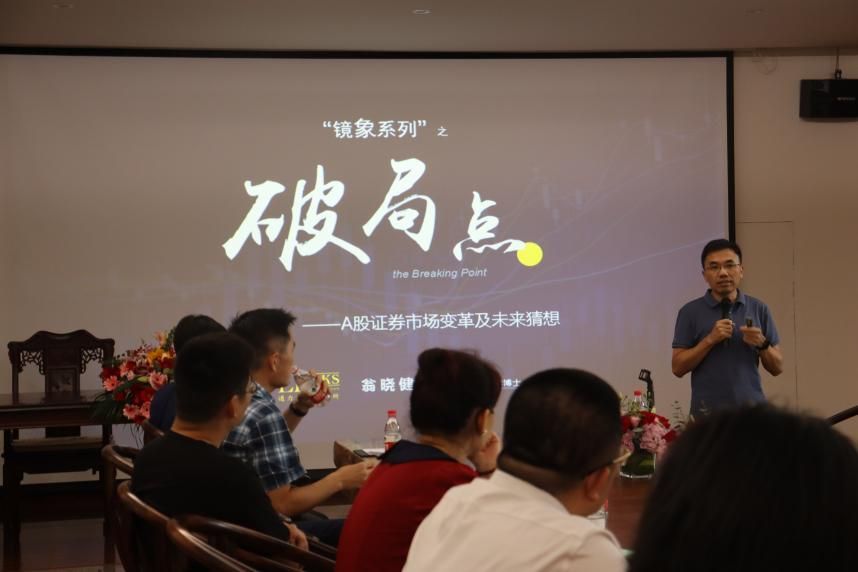 翁晓健律师指出,当前的变革将引起证券市场生态的巨大变化,而发展证券市场是当前经济秩序下的国家战略。他认为,未来二十年A股市场将迎来巨大发展。在对于A股市场的未来猜想上,翁律师引用了巴菲特的名言——“宁要模糊的正确,不要精确的错误”;他表示,世界正在迅速发生变化,而这些重要的变化在历史上已经多次发生,通过分析历史上各国的国力变化与转折点,他向同学们展示了“第一曲线”,经历了欺骗性迷茫区,就会达到破局点。