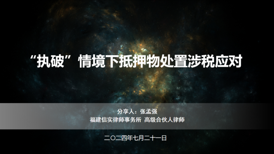 张孟强律师从办理实务的角度为大家分享了《“执破”情境下抵押物处置涉税应对》,张孟强律师从司法拍卖的主体、所涉税种、适用税率等方面介绍了司法拍卖抵押物所涉法税务交叉的业务知识,并结合程国琴教授的分享内容提醒企业要利用好“企业所得税弥补亏损年限”。